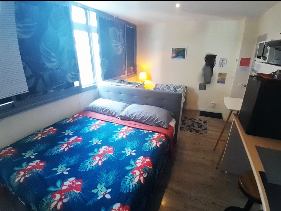 The Maeva studio is a furnished tourist accommodation of 19 m2. Located in accommodation with an other studio, it has its own private bathroom and a dining area. It is located in the city center of Papeete, 3 minutes walk from the Ferry Quay to reach the sister island Moorea. You can walk to the amenities of the capital: Market, shops, restaurants, bars, seafront...