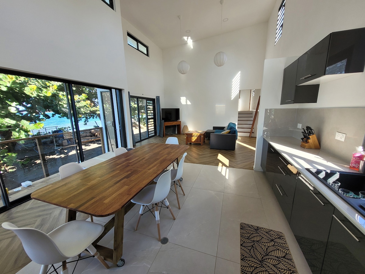 Logement de 80m2, avec en plus terrasse, deck et jardin de 200m2 en bord de mer avec vue sur MOOREA. Composition: - une grande cuisine familiale avec tout l'équipement nécessaire autour d'une belle table en bois de 6 places, - un salon attenant avec baie vitrée sur la terrasse - un coin chambre séparé par un rideau avec deux lits simples, - enfin, une suite parentale avec un grand lit king size (1,80x2m) et une salle d'eau, douche et WC. Logement parfait pour petite famille avec deux enfants.