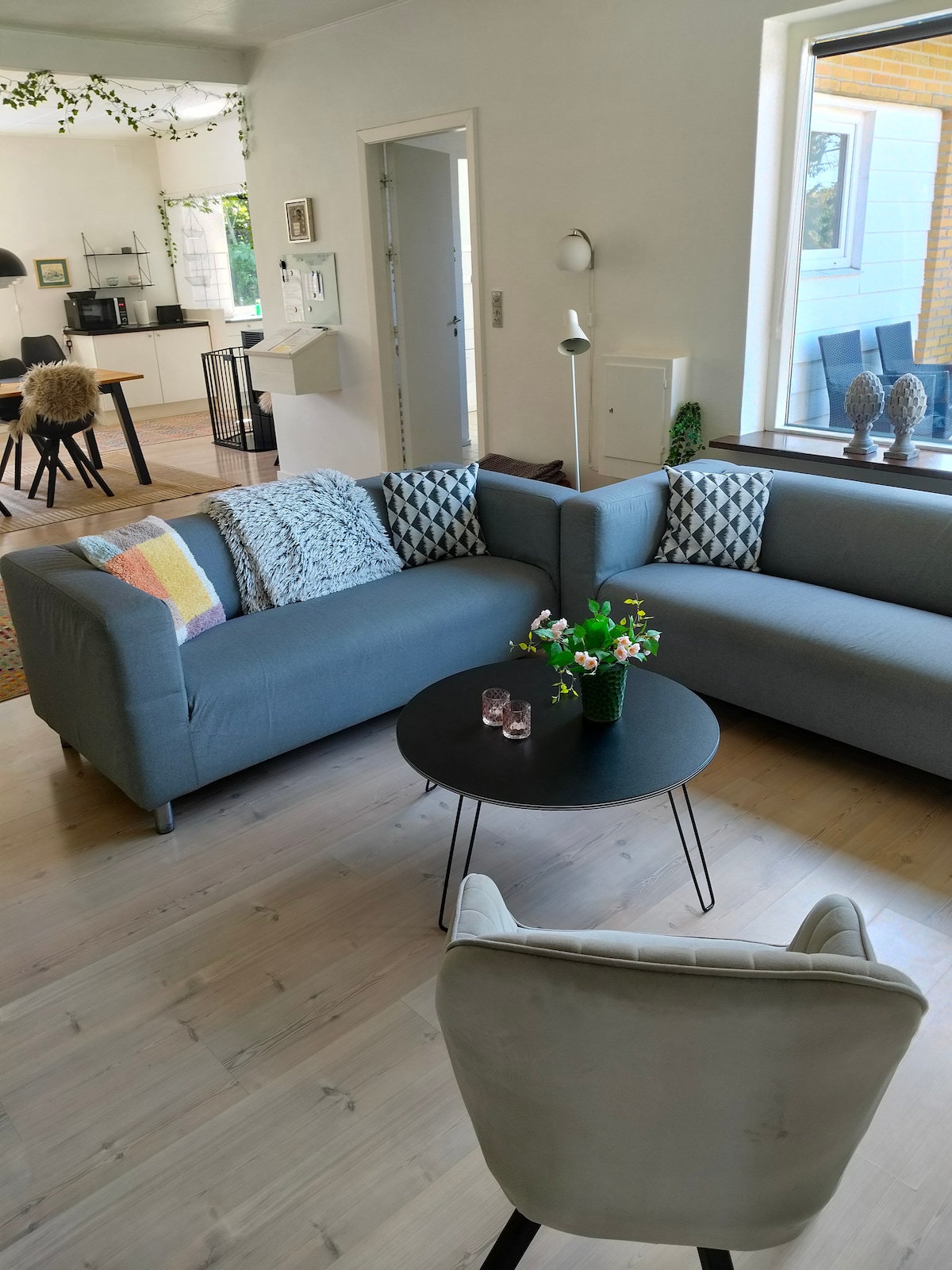 Nyd hygge og ro i ca, 50 m2 lys og lækker lejlighed under loftet i nedlagt kostald. 1 af i alt 2 lejligheder. Bygget i 2021. 2 soveværelser, stue med sovesofa, fuldt køkken, samt eget bad. Adgang til fælles pool. Ren idyl på landet, men med kun 2.5 km til gode indkøbsmuligheder, samt ca. 10 min i bil til fantastisk børnevenlig sandstrand. Hunde, katte og heste. Ejer bor på grunden, men i anden længe. Fibernet og tv-pakke. NYT 2025: Gameroom med bordfoldbold, bordtennis og retro spillekonsol.