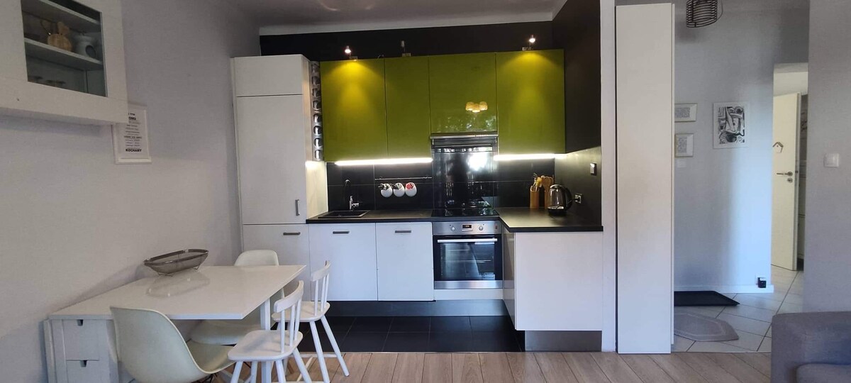 Zapraszamy Cię do zamieszkania w naszym nowym apartamencie, który przygotowaliśmy z myślą o Twoim komfortowym pobycie. Mieszkanie usytuowane w nowym osiedlu na granicy centrum, urządzone i wyposażone jest tak, aby goście mogli czuć się tu wygodnie zarówno podczas urlopu jak i pobytów służbowych. Dogodna lokalizacja pozwala bardzo szybko dotrzeć do głównych miejsc w Warszawie, a także łatwo dostać się w 10 min do lotniska oraz stołecznych dworców kolejowych.