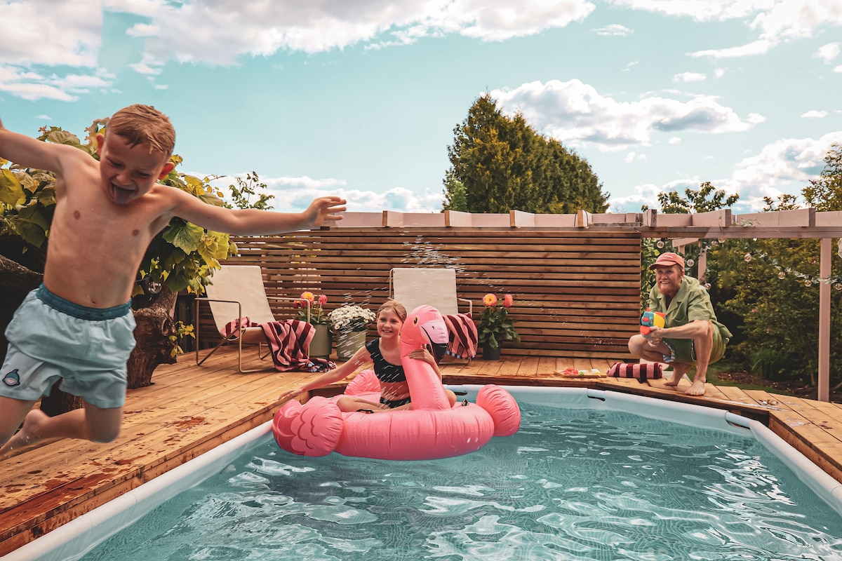 A warm cozy home in the center of Tjøme. From our home the stores are only 5 min walking, and all of Tjøme's beaches and forests are as close as a couple of minutes walking or driving. The big fenced garden gives plenty of space to enjoy a warm summer, with a swimming pool to cool down in. On the terrace you can enjoy late evenings around a fire, and even turn on the heating lamp should it become chilly. The interior has been designed to create a warm and homey atmosphere.