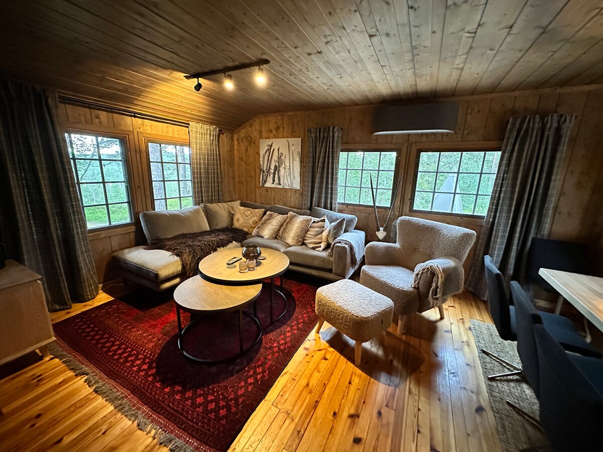 Traditional and cozy cabin in peaceful surroundings, perfect for the whole family! The cabin is set in scenic hiking terrain, ideal for walking, cycling, and skiing, with swimming and fishing lakes just below. Drive all the way to the cabin for easy access. It offers modern facilities such as sauna, bathroom with shower, toilet and washing machine. The kitchen is fully equipped with dishwasher, fridge, gas hob, and gas oven. All beds have duvets and pillows. Bed linen can be rented. Welcome!
