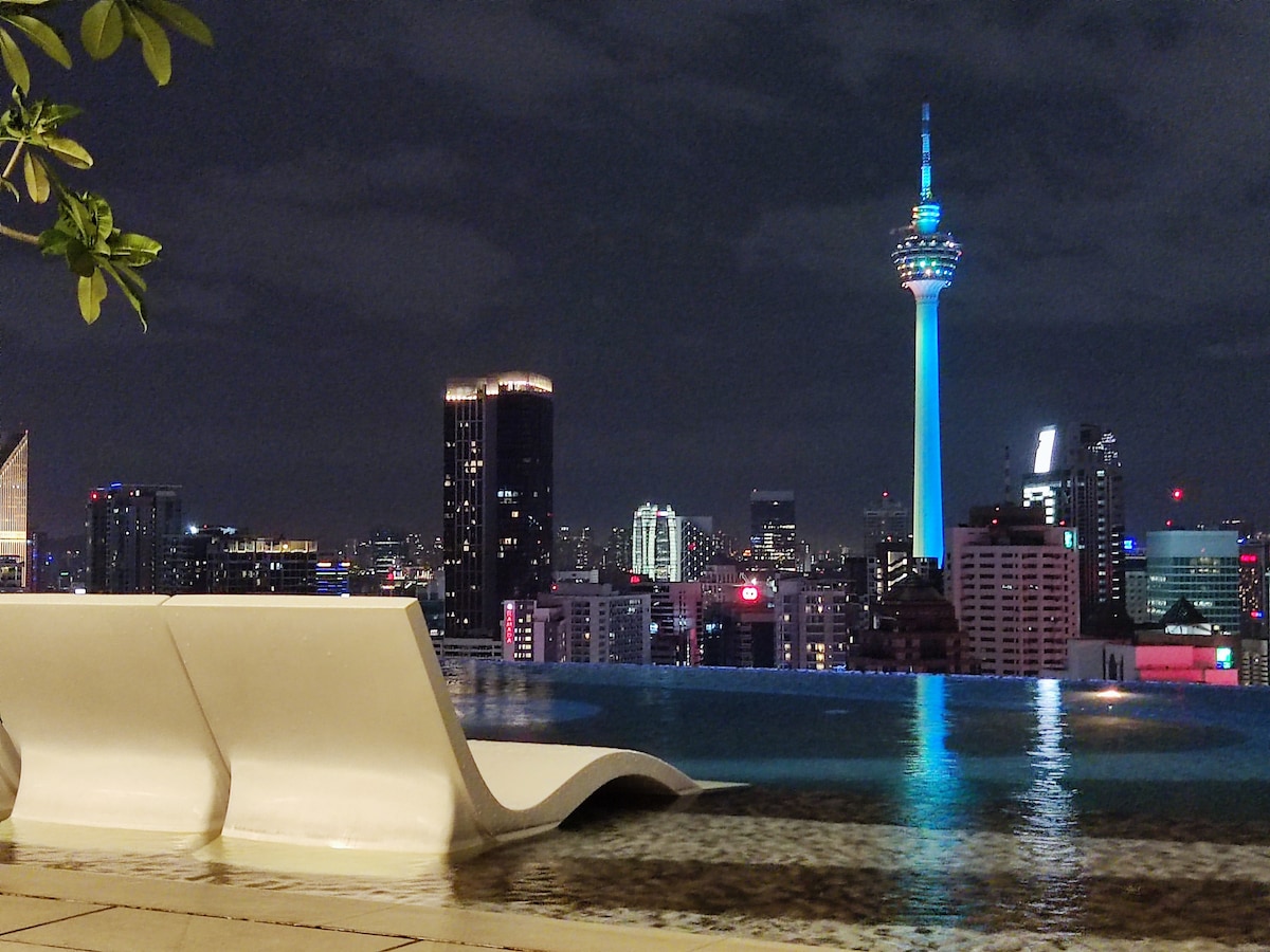 Stylish 1BR sky suite with a private balcony facing KLCC and KL Tower. Enjoy sky dining from your balcony while watching the dazzling light shows from both iconic towers every night. King bed, rain shower, full kitchen, washer with drying rack, Netflix, high-speed WiFi. Relax at the infinity pool, rooftop jacuzzi, and gym. Walk to Jalan Alor, Pavilion, Bukit Bintang, and the new TRX Mall. 24-hour check-in. Airport pickups and local tours available. Your perfect KL stay begins here!