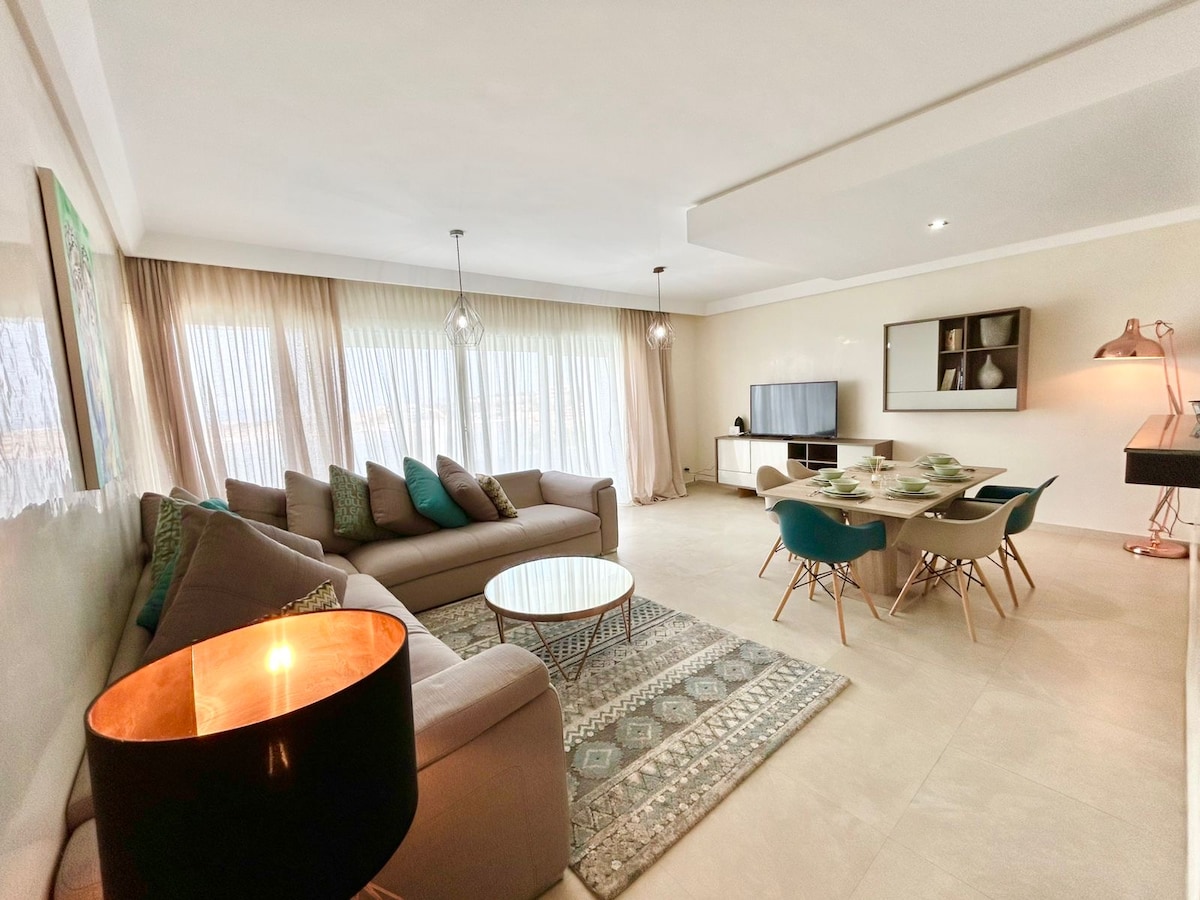 Offrez-vous un séjour d’exception dans cet appartement raffiné à Tanger. Profitez d’une vue dégagée imprenable sur la nature, avec la plage accessible à quelques pas. Le centre-ville est également à proximité, idéal pour découvrir la ville facilement. Chaque espace a été décoré avec goût et équipé avec du mobilier et des appareils haut de gamme pour un confort absolu : cuisine complète, électroménagers modernes, literie neuve et tout le nécessaire pour un séjour serein et luxueux…
