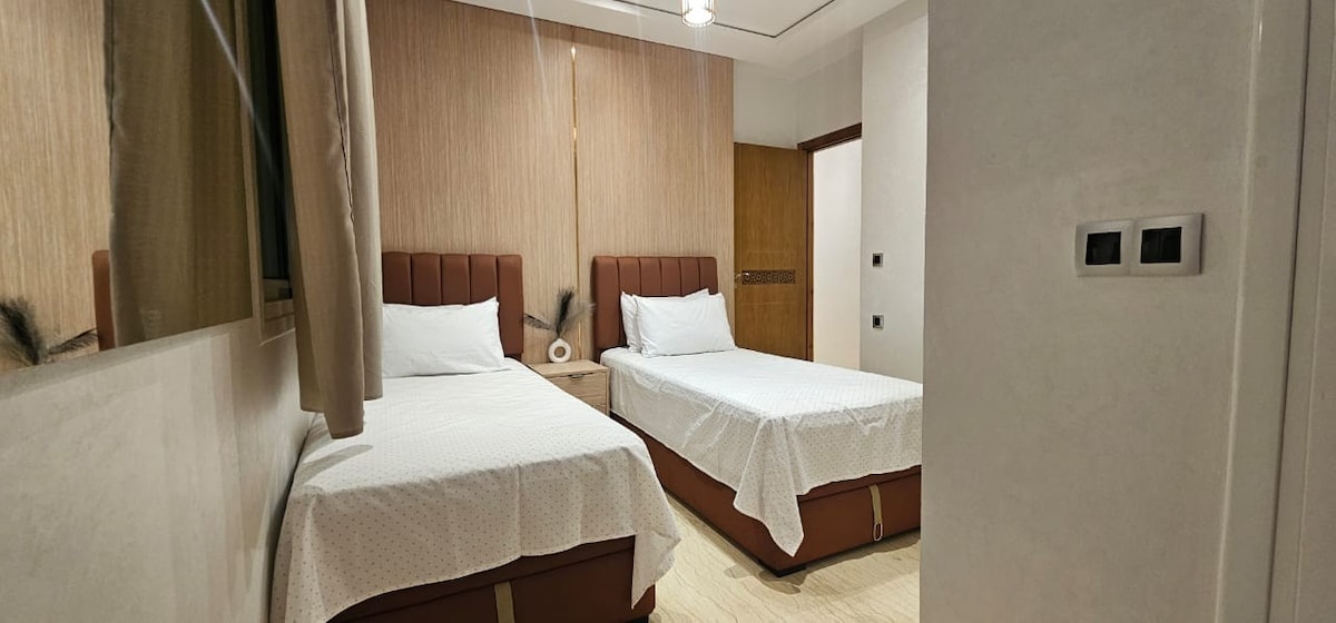 Appartement moderne et spacieux à Tanger, idéal pour un séjour calme. Grand salon avec Wi-Fi, salle à manger familiale, cuisine équipée et terrasse cosy avec vue sur la ville. Suite parentale avec espace de travail et lit bébé, deuxième chambre 2 lits, deux douches et clim centrale. Résidence sécurisée avec piscine, parfait pour vacances, familles ou détente.
