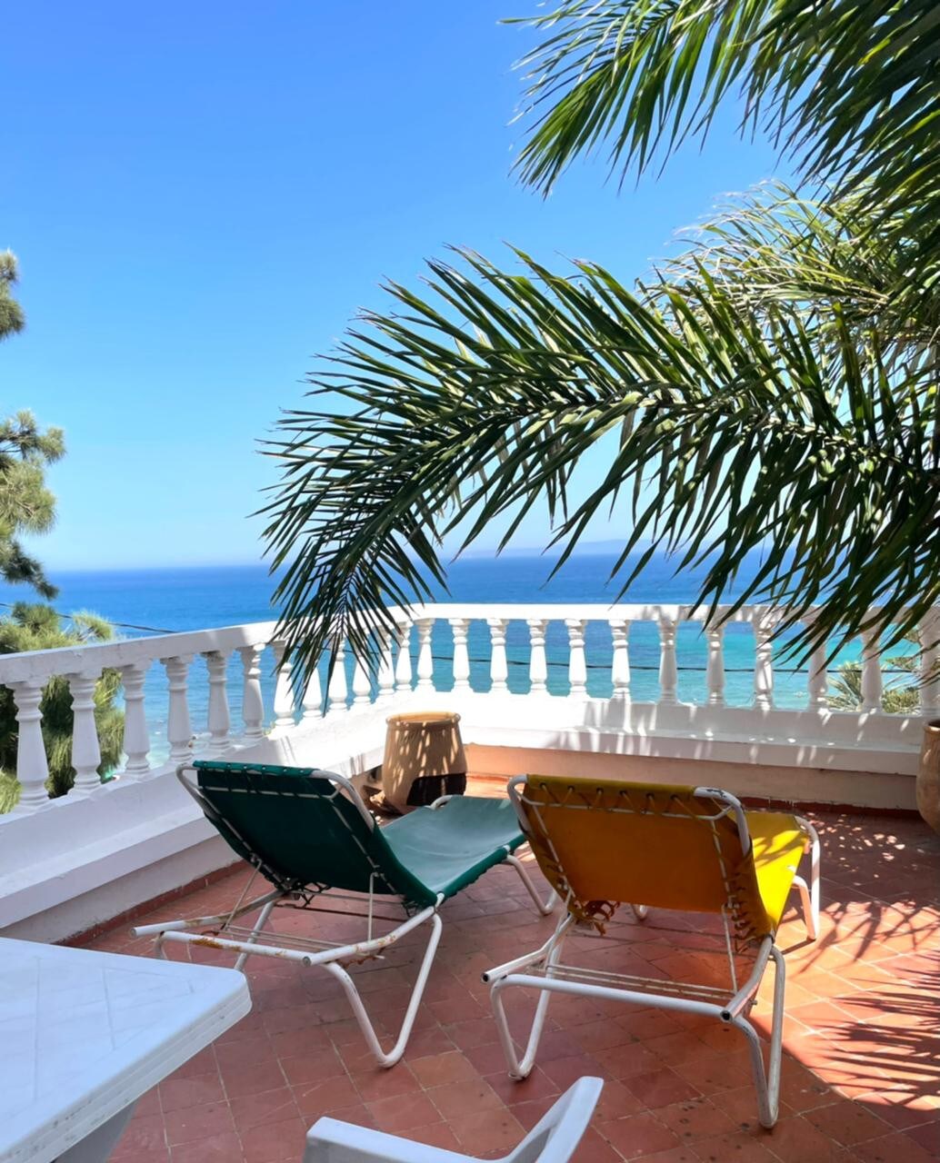Wake up to the sound of waves and stunning views of the Mediterranean, Tangier Bay, and even Spain. This 2BR seafront apartment in sought-after Malabata offers panoramic views from every room, terraces, direct beach access, a full kitchen, a smart TV, fast Wi-Fi, A/C, and gated parking. Just a 5-minute walk to cafés, Villa Harris Park, and Mogador Hotel. 11 min to the Grand Socco. ⚠️ Located on the 2nd floor (60 steps from the garage), no lift. 👶 Baby bed & high chair available on request.
