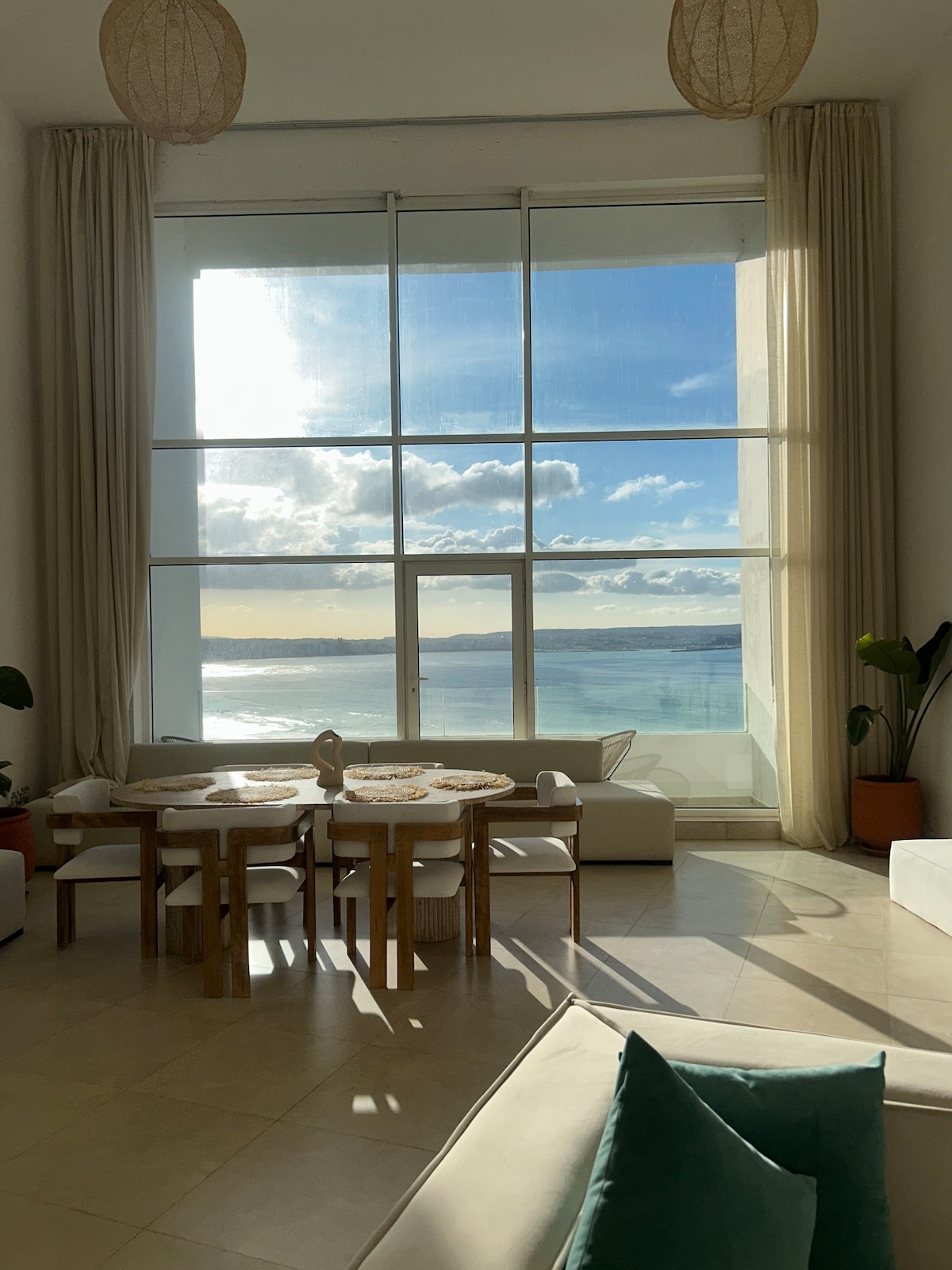 Wake up to the sound of waves and stunning views of the Mediterranean, Tangier Bay, and even Spain. This 2BR seafront apartment in sought-after Malabata offers panoramic views from every room, terraces, direct beach access, a full kitchen, a smart TV, fast Wi-Fi, A/C, and gated parking. Just a 5-minute walk to cafés, Villa Harris Park, and Mogador Hotel. 11 min to the Grand Socco. ⚠️ Located on the 2nd floor (60 steps from the garage), no lift. 👶 Baby bed & high chair available on request.
