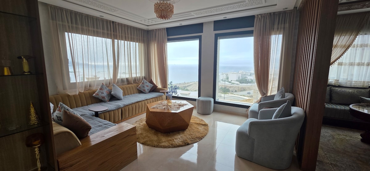 Appartement haut de gamme avec vue imprenable sur la mer Méditerranée. 3 chambres avec TV, 2 terrasses, balcon sur piscine avec accès direct, jacuzzi privé, barbecue, cuisine moderne, climatisation, Wi-Fi, et parking sécurisé. Situé dans une résidence calme, propre et surveillée. Réservé aux familles et couples mariés pour un séjour alliant luxe, confort et sérénité.