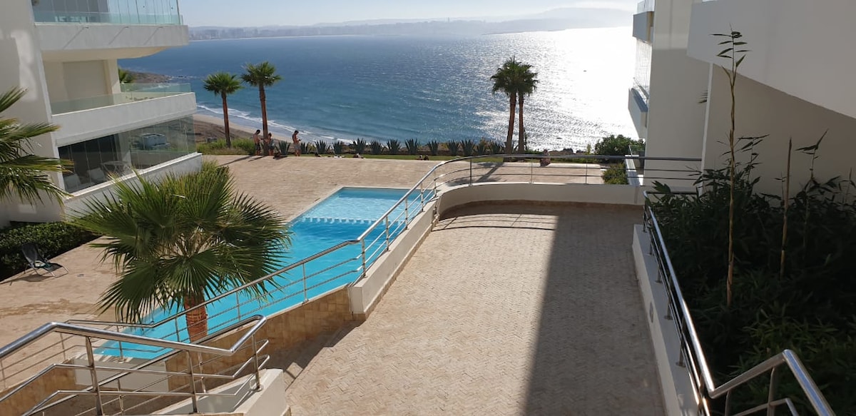 Bel appartement paisible avec accès piscine et vue sur mer.climatisation,wifi, IPTV.Le toit terrasse accessible en ascenseur vous permettra de bénéficier d'une vue panoramique sur la baie de Tanger.Vous pourrez aussi garer votre voiture dans un parking sous terrain avec télécommande.Les plages méditerranéennes ainsi que le parc aquatique M'nar Park est à 5 minutes à pied. La résidence est sécurisée 24 h sur 24.