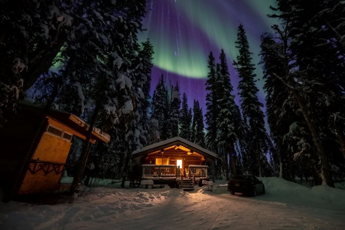 Relax and unplug at this peaceful Alaskan glamping retreat. Stay in your own cozy log cabin tucked along Goldstream Creek beside a quiet pond—an excellent spot for wildlife viewing and Northern Lights sightings in winter. The cabin has hot and cold running water at the sink and, NEW this year, a private heated outhouse for comfort even in subzero temps. Showers and laundry are available 1.8 miles away at Goldstream General Store. Winter stays require 4x4 and proper winter tires.