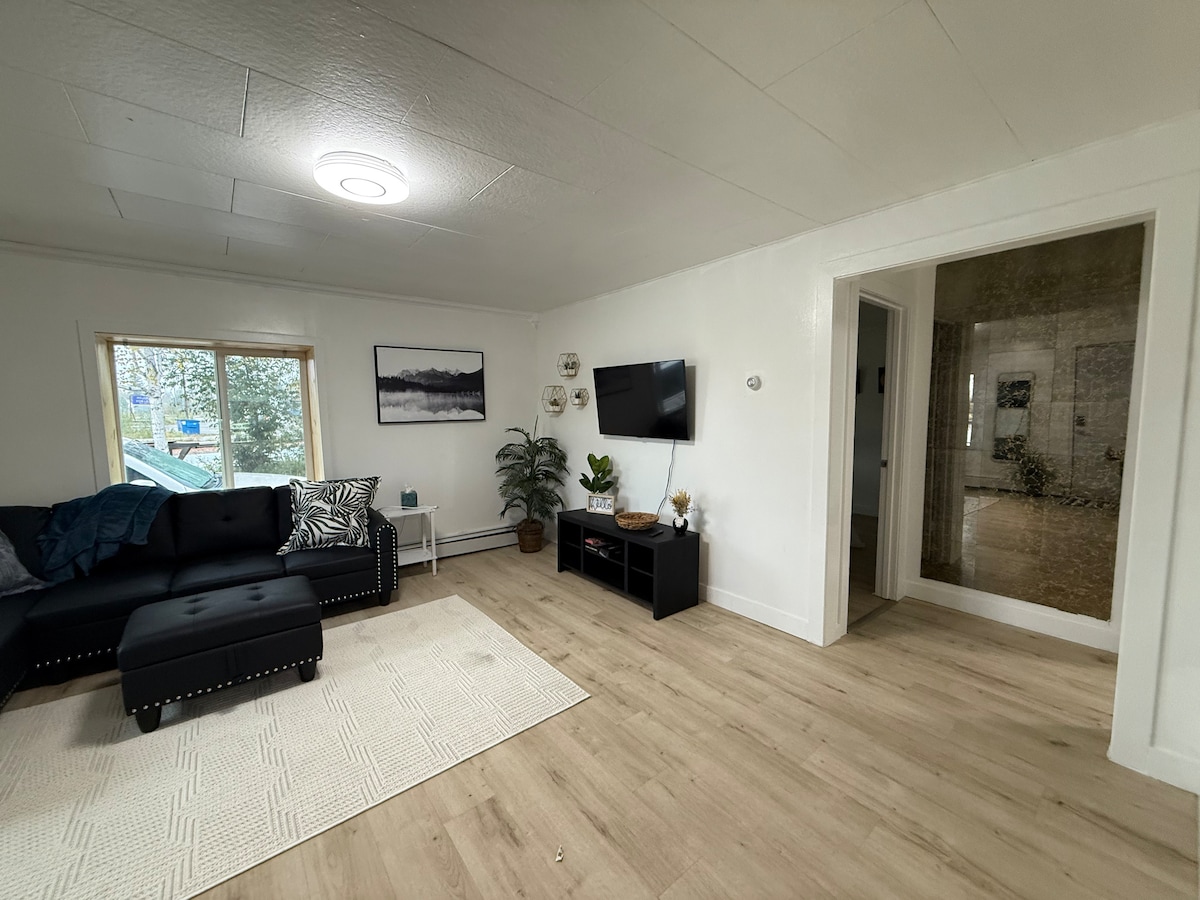 This is a brand new modern Alaskan apartment. Have a great day of outdoor adventures and come back and enjoy a warm bath in a jetted tub with custom tile shower surround. Brand new couch with ottoman and sleep on a comfortable king size bed. For the cold winter days warm up your feet on the nice radiant heated floor. Self check in. Washer and dryer! 65” QLED TV in living room. Bedroom TV as well. Close to the airport, UAF, tourist attractions, stores, restaurants, trails and bus stop.