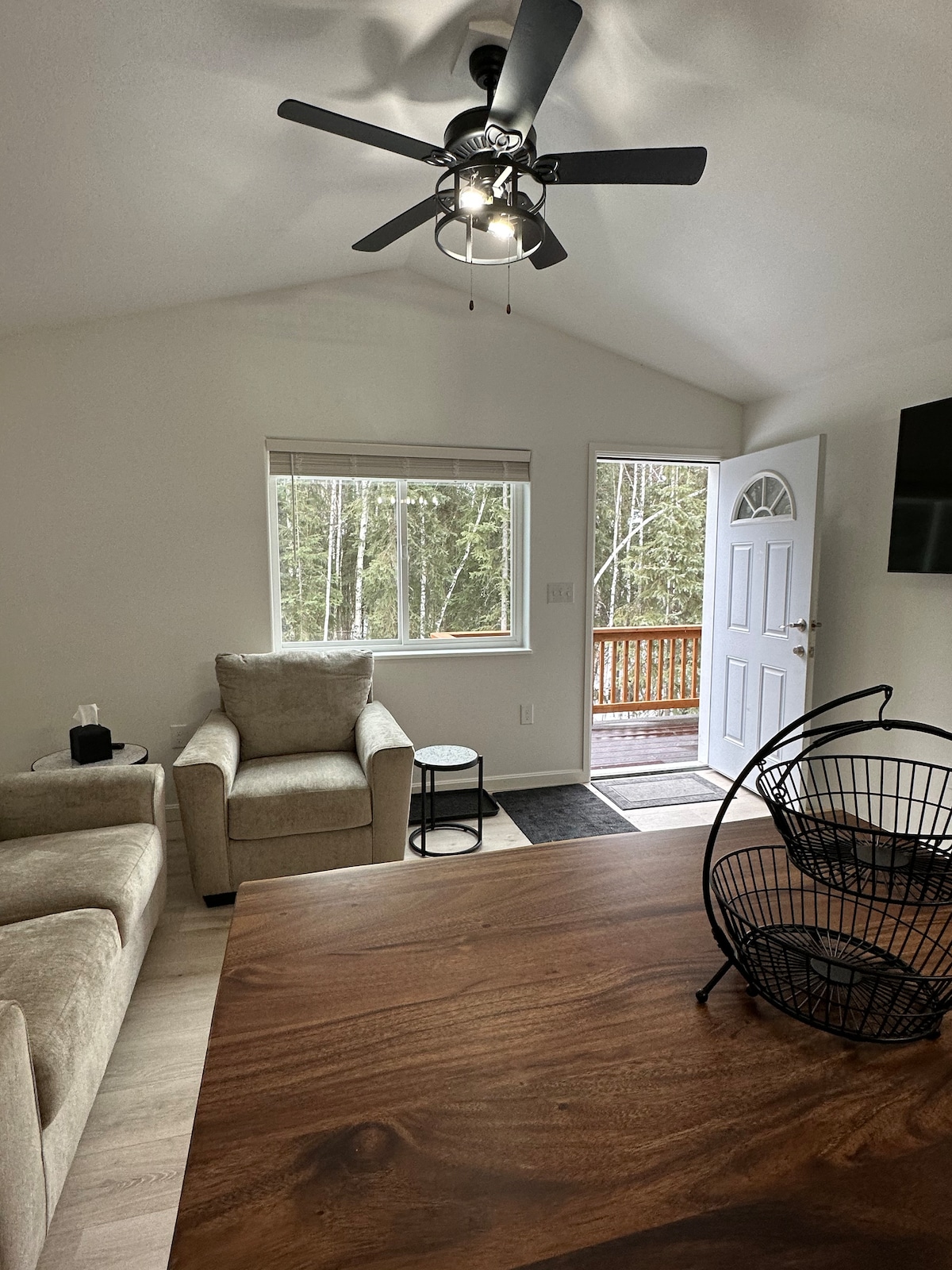 This beautiful private entrance, 2 bedroom mother-in-law apartment offers a great view of the Tanana Valley, wildlife and Auroras from the privacy of your own cedar deck. While seeming remote, it offers full amenities such as unlimited internet, a washer and dryer, a full kitchen and bath and is only 10 minutes from town. This apartment is perfect for a family wanting to experience Fairbanks Alaska without breaking the bank, staying at a crowded downtown hotel or giving up home luxuries.