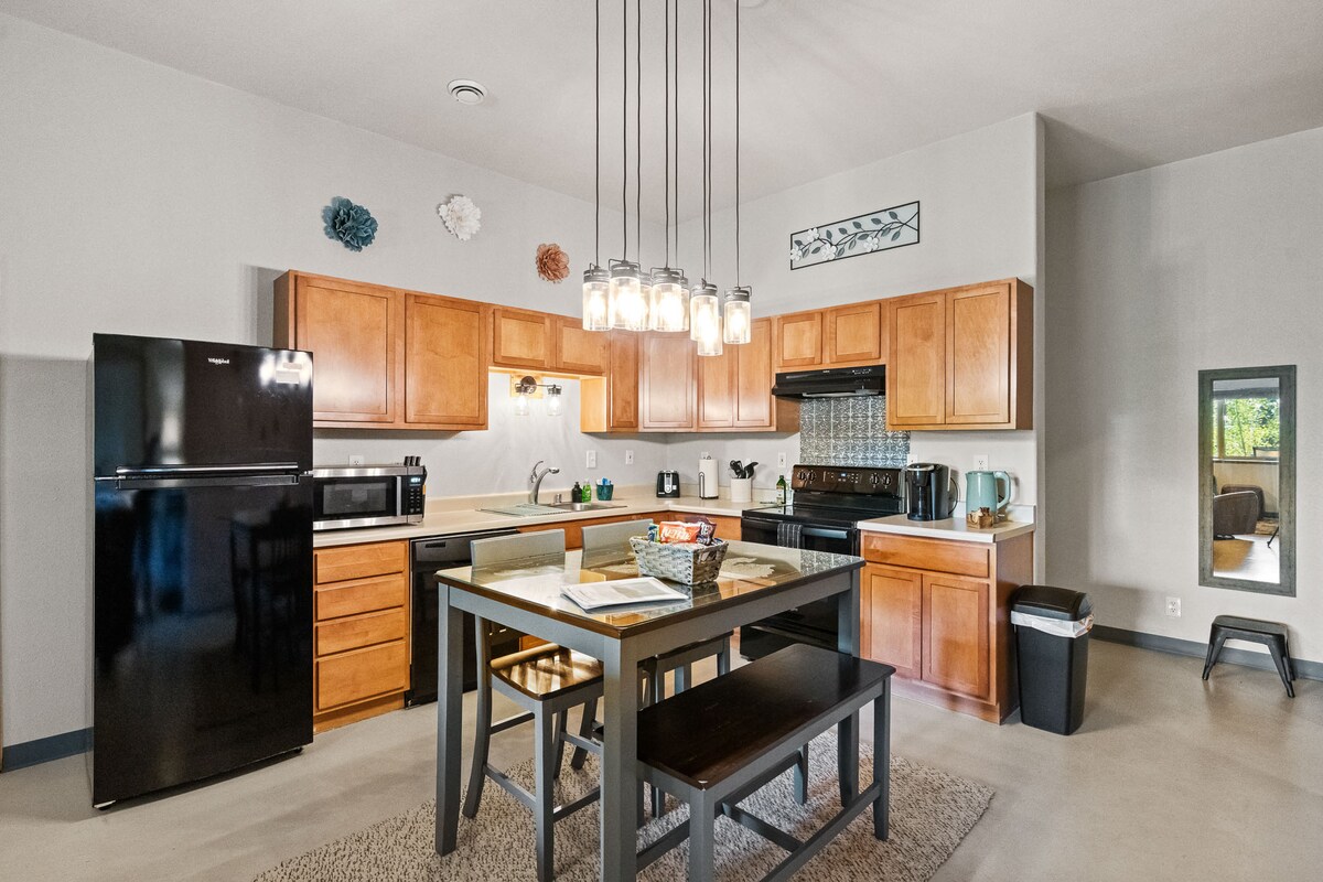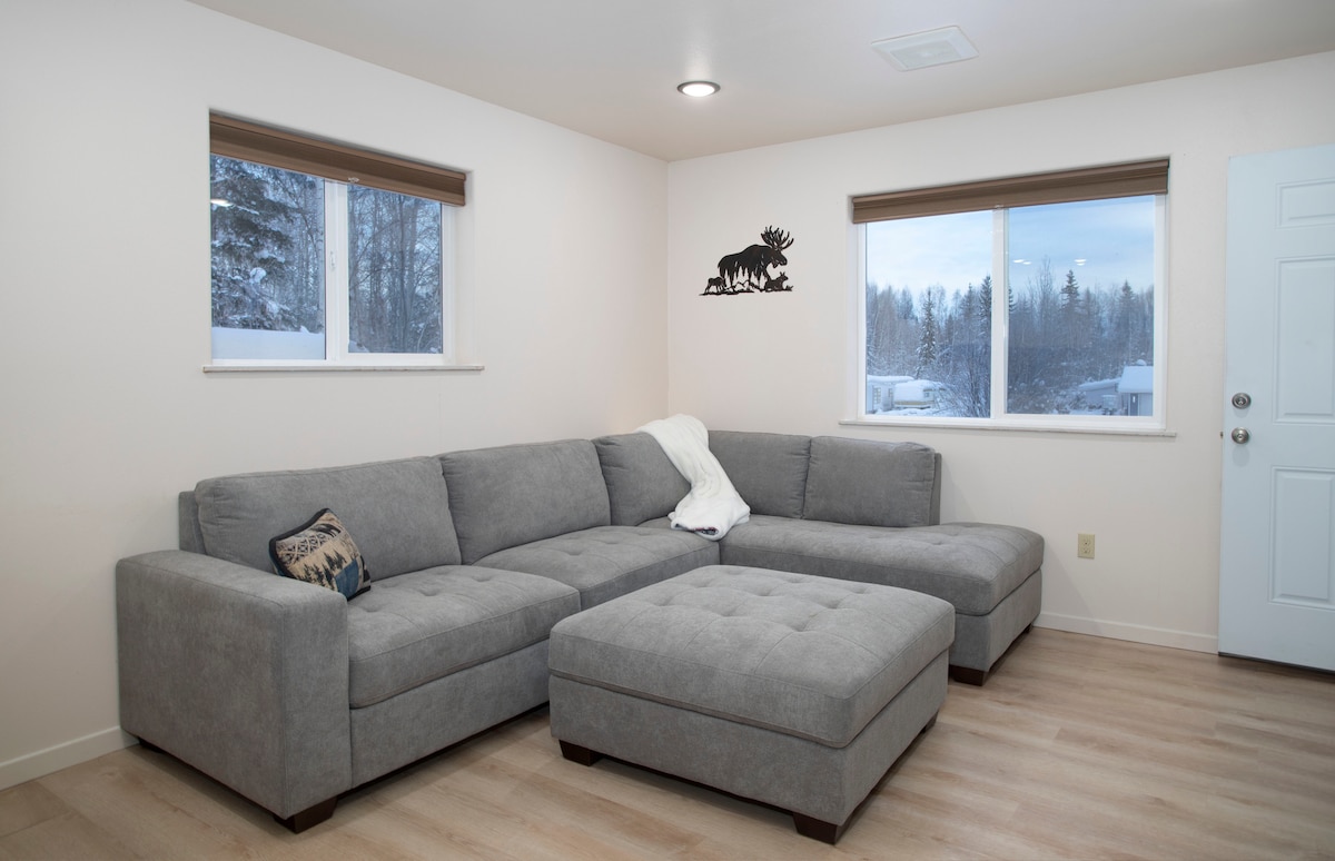 This 700 square foot walkout basement guesthouse has its own private drive and entry. Cook in the open kitchen, or grill out on the porch while enjoying the yard and get a peek of the Alaska Range and Tanana River through the trees. This newly remodeled unit has a washer and dryer, radiant heat, and 58 inch smart TV. (Squirrel Hollow sits below our larger unit, Fox Den, and they can be rented together for groups of up to 14 guests).