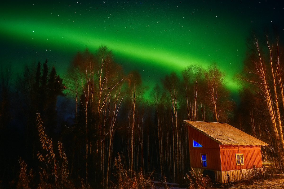 Welcome to Frontier Village! Enjoy your stay in our beautiful modern guest cabin! Nestled in a mature birch forest between Fairbanks and North Pole, you are only minutes from everything. Outside the city lights enjoy fantastic views of the aurora, watch the local bush planes flying overhead from the nearby runway, or just relax on the porch and maybe spot a moose or fox. Each cabin sleeps up to two couples (4 guests). Whether you're here for work or play, you will enjoy your stay.