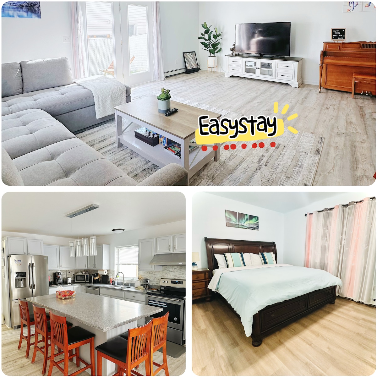 欢迎来到 Easystay! 我们的民宿温馨舒适,地理位置便利,非常适合家庭或团队入住。 房子周边生活便利,沃尔玛(Walmart)、好市多(Costco)、麦当劳(McDonald’s)、熊猫快餐(Panda Express)等餐饮和购物场所都在几分钟车程内。机场距离也很近,出行十分方便。喜欢户外活动的客人也会很喜欢这里,因为滑雪场就在附近,轻松即可抵达。 房子共有四间舒适的卧室,配有齐全的厨房设备,让您可以轻松准备家常菜。我们还为家庭旅客准备了婴儿床和儿童餐椅,并提供烧烤架,让您可以和家人朋友一起享受温馨的户外时光。 为了让您的住宿更加方便,我们提供洗衣机和烘干机,以及咖啡机和小零食,为您带来家的温暖与贴心。冬季出行也十分无忧,您可以将车辆停放在带暖气的车库内,不用担心严寒天气冻坏车辆。车库门口还可停放两辆车,并配有插电接口,为您提供贴心的便利。 无论您是来度假、周末休闲,还是团队旅行,我们都希望 Easystay 能成为您在费尔班克斯(Fairbanks)温暖放松的家