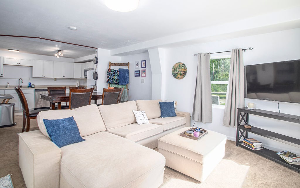 This two-story haven is designed with modern living in mind, featuring three generously sized bedrooms, 2.5 bathrooms. Bright living room with a smart TV, comfortable couch, pull-out sofa for extra guests, coffee table, and ambient electric fireplace. The open-concept kitchen with stainless steel appliances. Dining area accommodates eight guests, perfect for dinner parties and family gatherings. Garage, additional driveway, and street parking, walking distance of local stores and restaurants.