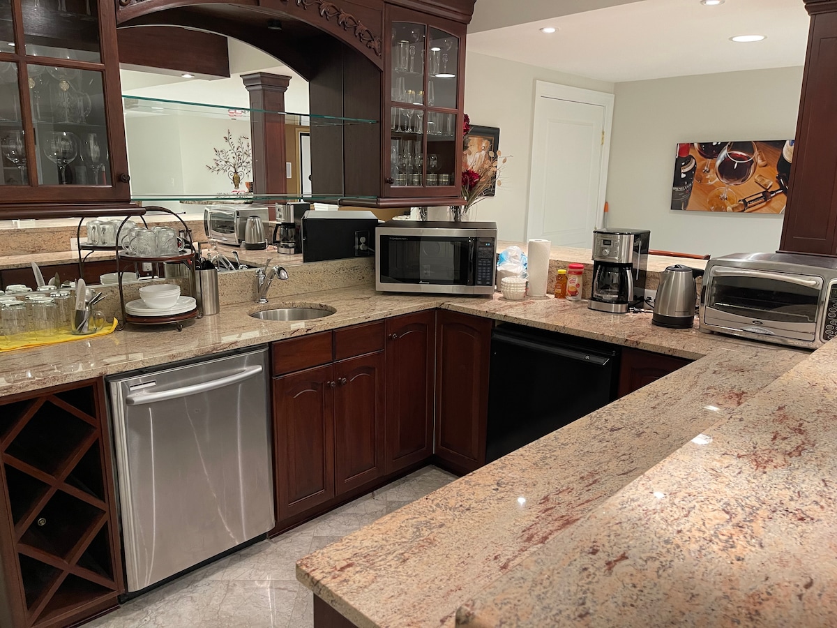 Beautiful, peaceful, upscale, quiet, clean, safe DC/NVa/Quantico suburb. Diagonal from lake jogging path. XL priv basement suite: priv entrance; bath; 3-tiered seating movie theater w/9 recliners, drink fridge, popcorn machine; FULL kitchen; laundry; dining/office; walk-in closet; living room TV; qn and full Tempurpedic (adjustable full), twin beds. Kitchen: Breville oven, microwave, full size fridge, Keurig, sink, ice maker, garbage disposal, dual burners, dishwasher, rice maker, crockpot.