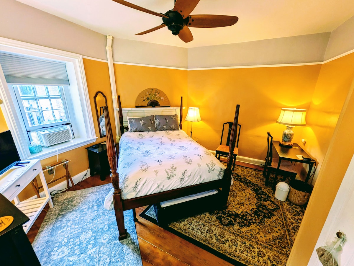 On a peaceful side-street, next to Passyunk attractions, South Street, downtown, dining and shopping 5min or less, this 1-bedroom private house (no other guests or host) has its own 2 private bathrooms, private balcony with stunning views of the city skyline, kitchen, a full bed (sleeps 2) and a comfy pullout couch (sleeps 2). 1st floor includes living room with TV, back patio & garden, kitchen & full bath. Add an extra bedroom upto three, $45/night, or see our 4br listing for the same house.