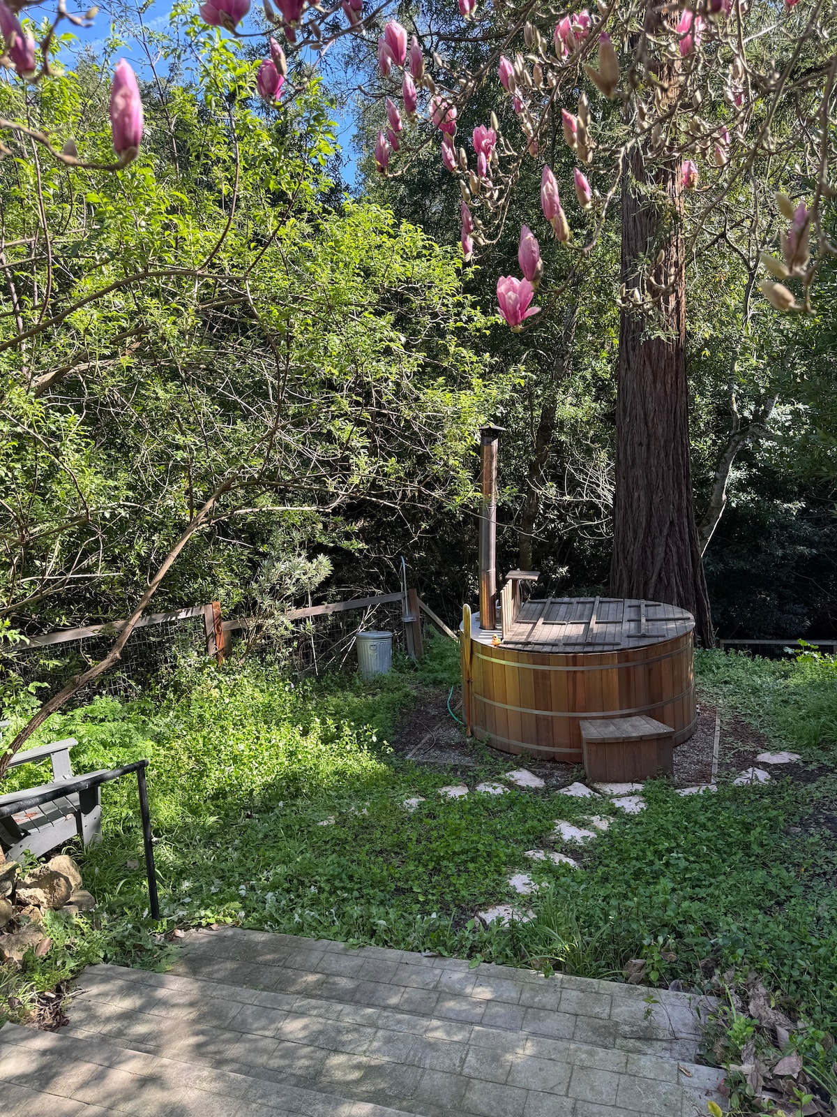 Hike up to a well designed, small-but-mighty modern cabin with fast WiFi, your own hot tub and a panoramic view spanning across the bay from the Golden Gate to the San Mateo bridge. 108 stairs lead up to the Aerie, so if you don’t want to get your steps in, this is probably not the space for you! 15 min from OAK and city life, but a world away. Sunsets are glorious here. The Aerie is a special spot just for 1 or 2, so leave the posse behind. Registered guests only.