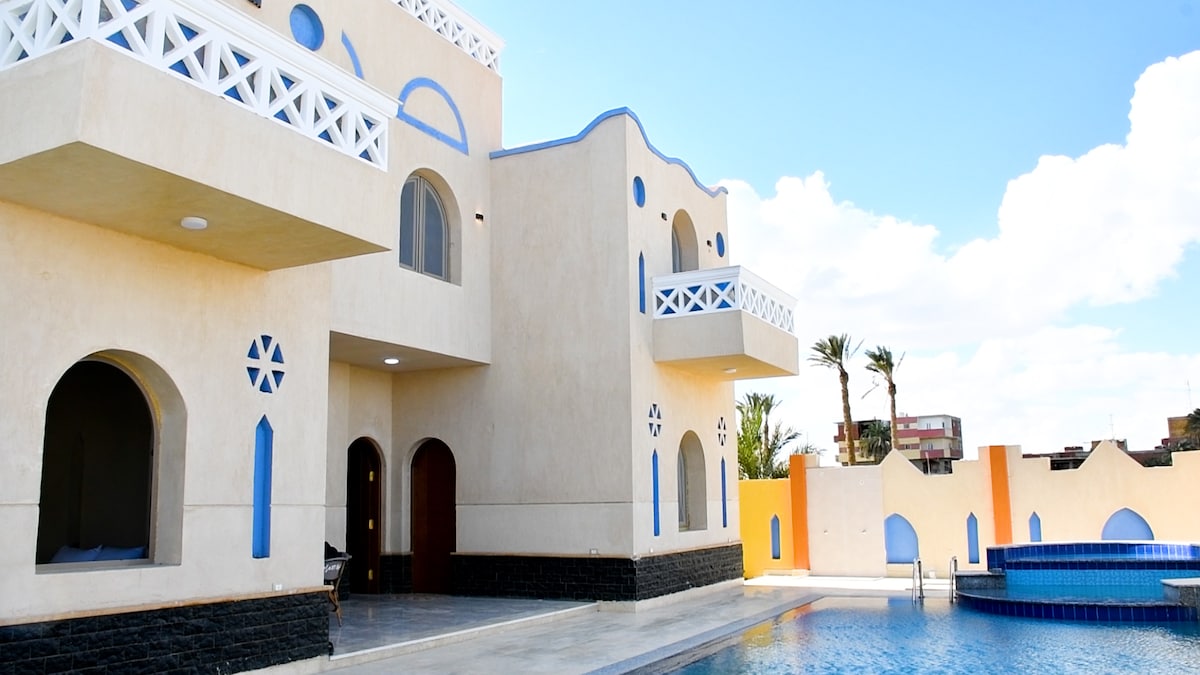 A uniquely architected private accommodation in Tunis Village overlooking the scenic Qarun lake. The living space includes the 1st floor of a gorgeous villa with a beautiful garden and outdoor pool, featuring 2 large bedrooms, a kitchen, living/dining hall, upper terrace and a full bathroom.