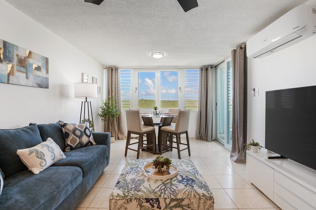 Azul Marino is our spacious one bedroom overlooking the east coast of Puerto Rico. Located inside a 5 stars resort, you have a golf course, 2 pools, hot tubs and be near the main excursions of Puerto Rico. Be minutes away from the bioluminescent bay, take a catamaran to the islands and enjoy a entire day at the beach doing snorkeling or just relaxing. This apartment had a full size kitchen, enormous living room and a very confortable king size in the bedroom.