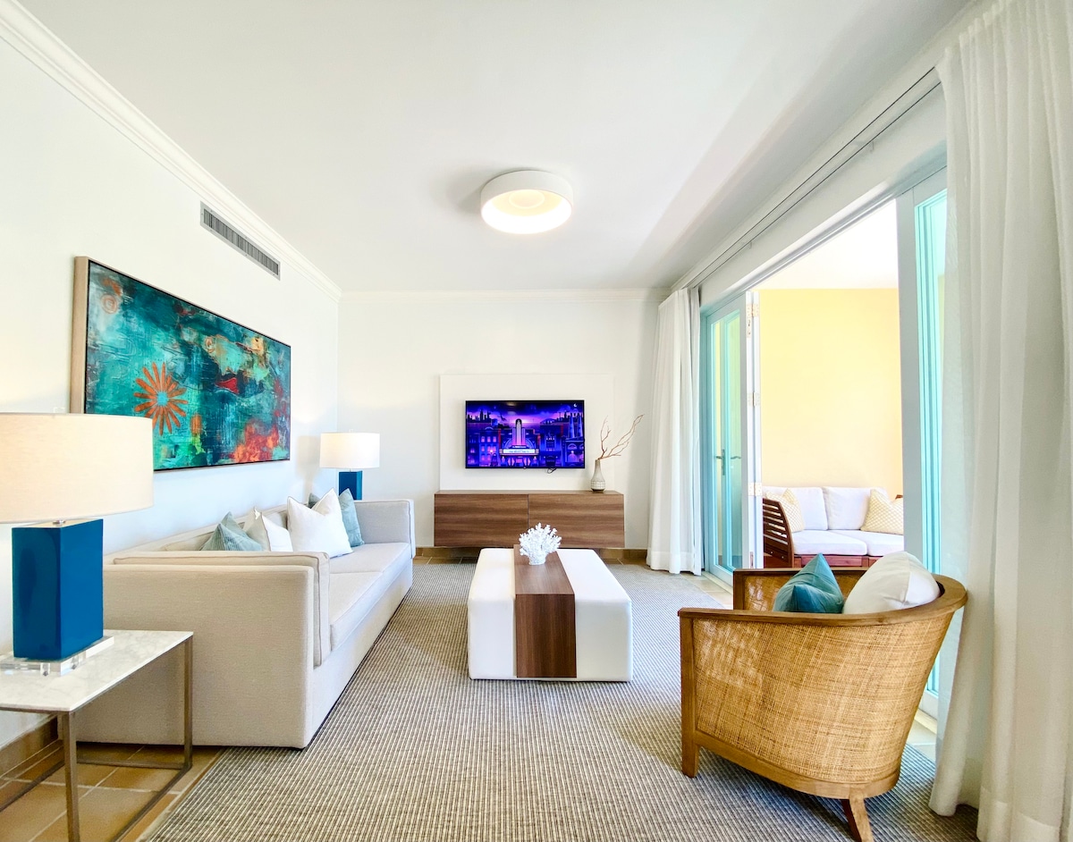 Azul Marino is our spacious one bedroom overlooking the east coast of Puerto Rico. Located inside a 5 stars resort, you have a golf course, 2 pools, hot tubs and be near the main excursions of Puerto Rico. Be minutes away from the bioluminescent bay, take a catamaran to the islands and enjoy a entire day at the beach doing snorkeling or just relaxing. This apartment had a full size kitchen, enormous living room and a very confortable king size in the bedroom.