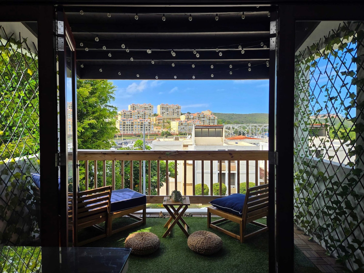 Apt with one bedroom, recently remodeled with queen bed, a full size bed, ac, full kitchen, sofa and a terrace with a nice panoramic view to Las Croabas Bay, Palomino Island. Vieques and Culebra. Just 5 minutes from Seven Seas beautiful beach and waking distance from famous fluorescent lagoon, restaurants and the water taxi pick up dock.