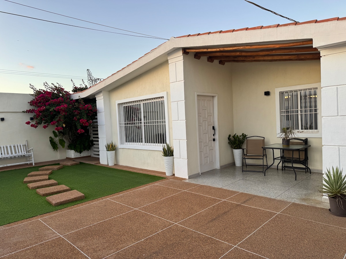 Acogedora e independiente casa, ideal para corta o larga estadía de 3 habitaciones, 3 baños , A/A en todos los espacios, wifi, área de entretenimiento/descanso/biblioteca, estacionamiento privado, tanque de agua, área de lavandería, cercado eléctrico y alarma, calentador de agua. La ubicación de la casa, da fácil acceso a panadería, farmacia, restaurantes, bodegón y estación de servicio. Cerca del PN Los Medanos. Cuenta con sistema completo de seguridad y privacidad.
