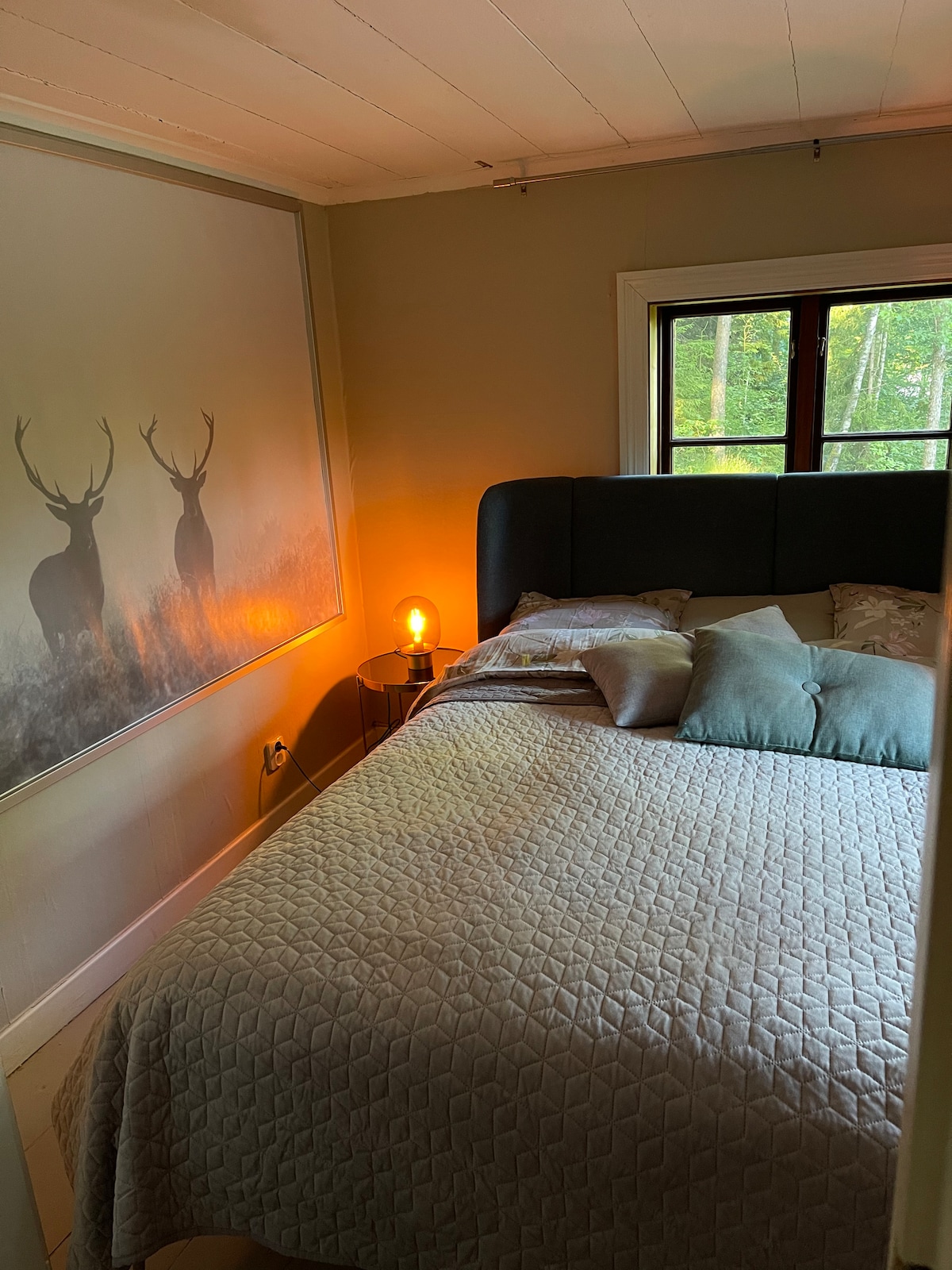 Timrad stuga mitt i Åkulla bokskogar. Storstuga med vedkamin, litet kök, sovrum och sovloft. Bäddade sängar och handdukar ingår liksom städning av alla utrymmen innan ankomst. Vedeldad bastu och toalett i separat liten stuga. Utedusch med kallvatten. Badmöjligheter i bäck och damm och närliggande sjöar. VIKTIGT! Inget fallskydd på sovloftet. Ingen fast stege till sovloftet. Inget staket vid dammen eller mot vägen. All vistelse sker under eget ansvar.