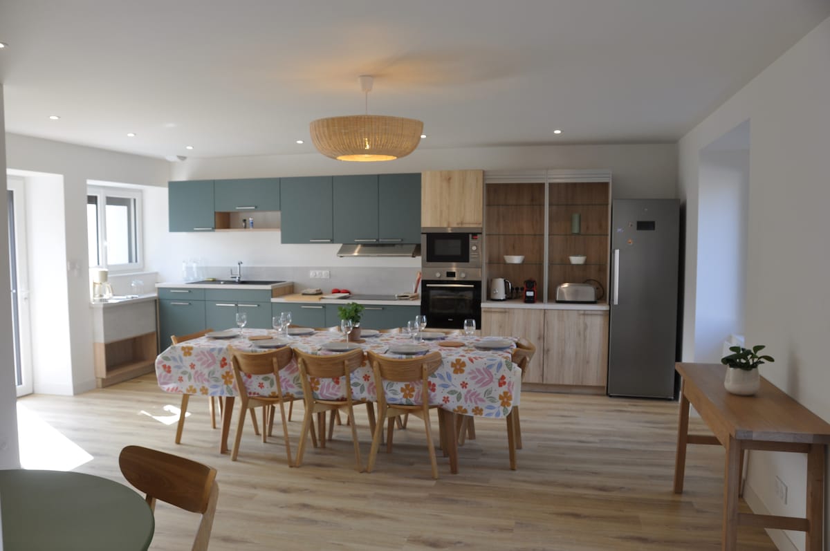 Détendez-vous dans ce logement unique et tranquille. Cette ancienne école abrite deux grandes chambres composées de 7 couchages, 2 salles de bain, d’un espace repas et d’une terrasse. Vous aurez accès à un bel espace extérieur partagé avec les propriétaires vivants dans la maison à côté. Ce lieu central vous permettra de découvrir la Vendée : à 30 minutes des plages de Saint Gilles Croix de Vie, à 1h du Puy du Fou, à 1h de Noirmoutier… À 7 minutes en voiture des commerces du village du coin.