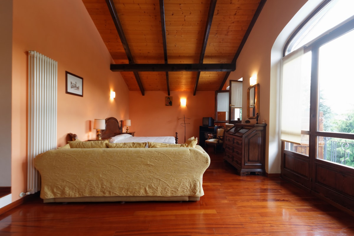 The flat is at the second floor of our house that is a sort of farm. There is a nice view on the Alps and our garden. Wooden floors, 3 bedrooms and 2 bathrooms. The suite has king size bed, a sofa and kitchen in the bedroom . Another room with 2 beds and sofa, and a third room with a double bed that I can separate in two single beds.
