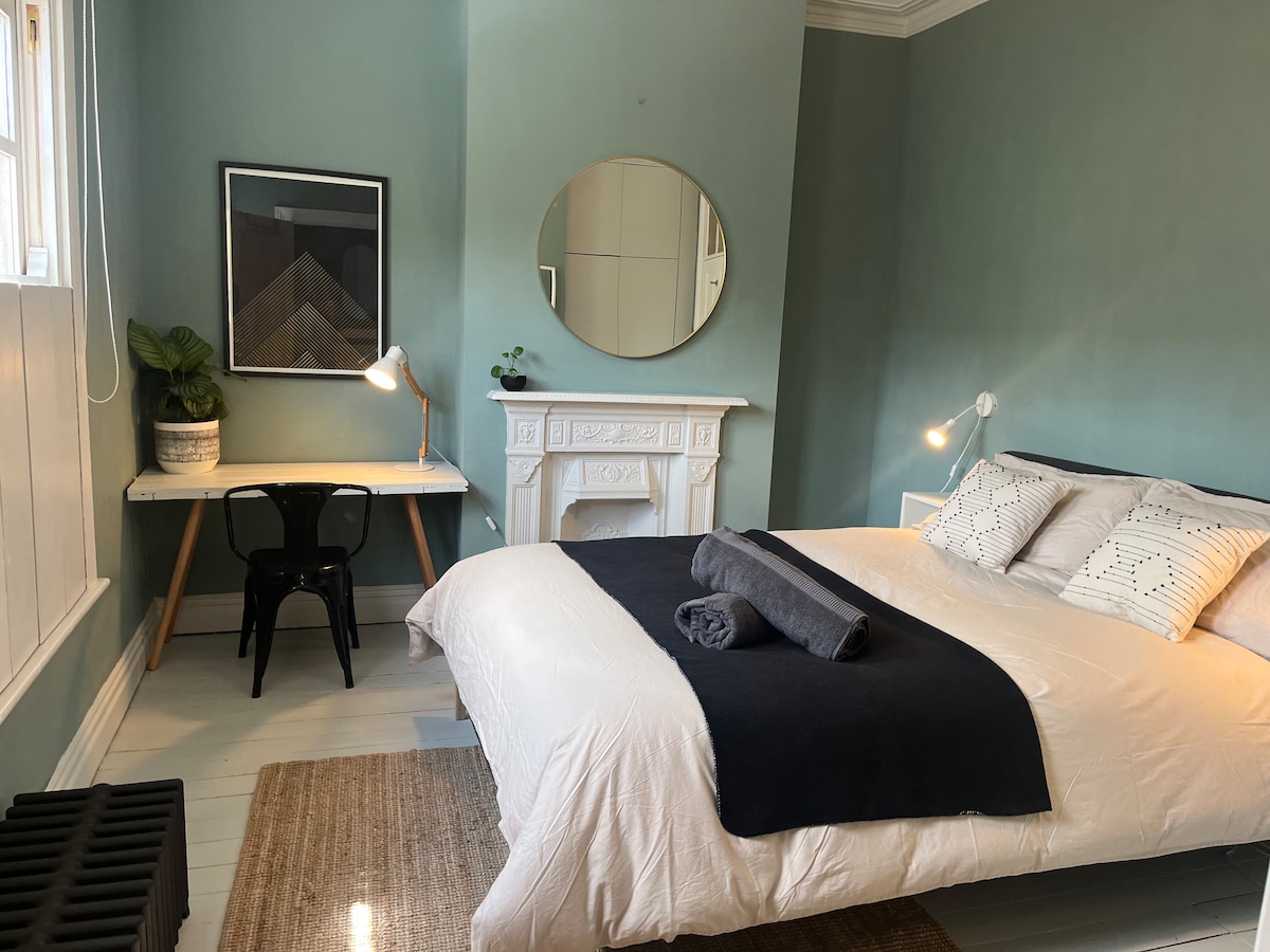 Take a break and unwind at this peaceful oasis. A light and airy Victorian town house with tall ceilings & loads of character. This room has a table and 2 chairs giving the option of working in the room. Brand new bed & mattress with extra pillows and blanket & electric blanket too! You are welcome to use the kitchen and dining area and there is fridge space available. There are plenty of books & games. You're welcome to enjoy the garden! Very friendly host. There is a cabin lock on the door.