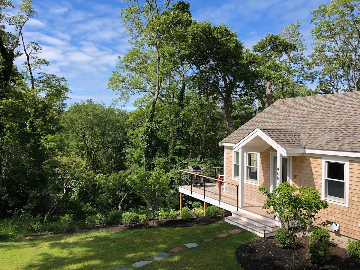 Contemporary cottage on quiet, private, wooded lot. Pristine, bright & comfortably furnished. Open living area, hardwood floors, vaulted ceilings, indoor/outdoor fireplaces, well appointed kitchen, washer/dryer, cable/internet/phone with unlimited national calling, SmartTV with Netflix and additional internet streaming services. Walk or bike to beaches and trails, 5 minute drive from downtown shops and restaurants. Property abuts West Chop Woods with lovely, quiet walking trails.