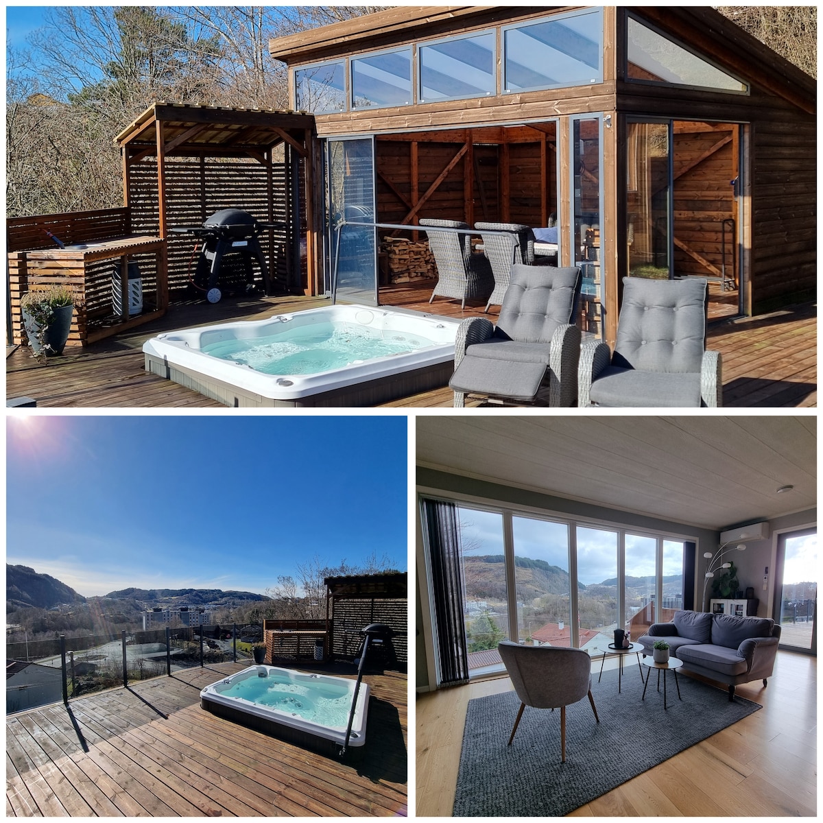 En hytte fra 2017 med nydelig sjøutsikt som kan nytes fra de store vinduene eller fra jacuzzi på terrassen. Interiøret har rolige naturfarger, nordisk stil. Peis i stue, åpen løsning fra kjøkken. 1.etg: 2 soverom, 2 bad, stue og kjøkken, samt vaskerom og entre. 2.etg: 2 soverom og hems med dobbel sovesofa. Totalt 14 senger, pluss reisesenger. Evt ekstra madrasser til gulv. Flotte turmuligheter i nærområdet, båtutleie, samt en fin liten sandstrand nedenfor Panorama hotell og resort like ved.