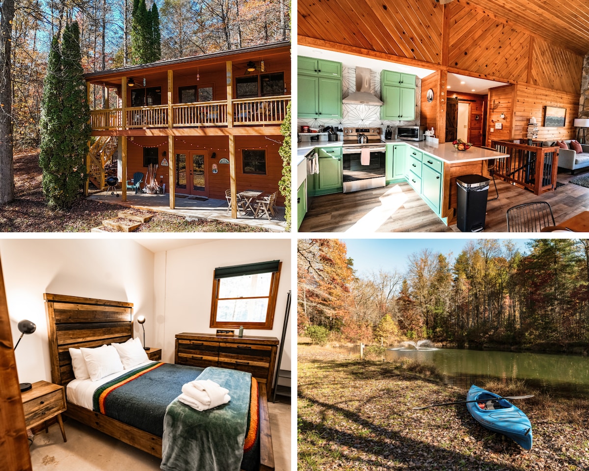 Escape to our renovated cabin with a modern kitchen and spa-like bathrooms, perfect for relaxation. Enjoy creekside fishing and kayaking (kayaks provided) or unwind by the screened-in porch fireplace. Nestled in privacy beside the soothing sounds of a rushing waterfall in the creek, it’s the perfect place for creating cherished memories! "Beautiful spot. Great house. Will definitely stay again!"~Jamie, November 2024
