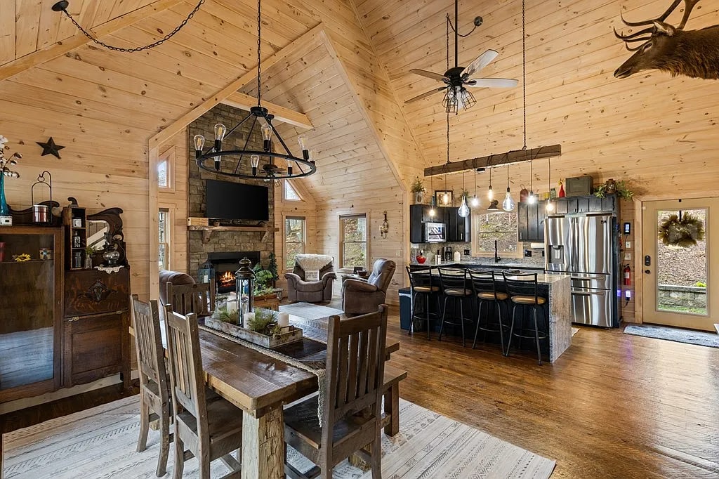 Escape to the serene charm of Lantern Landing, a brand-new cabin perched above Lake Blue Ridge. This 3-bedroom retreat blends luxury and comfort with en-suite bathrooms, sweeping lake views from a private deck, and inviting common areas. Unwind by the outdoor fire pit, soak in the hot tub, or explore the lake with complimentary kayaks. The patio features a large flat-screen TV and a game table with ping-pong and air hockey. Lantern Landing offers an unforgettable getaway for family and friends.