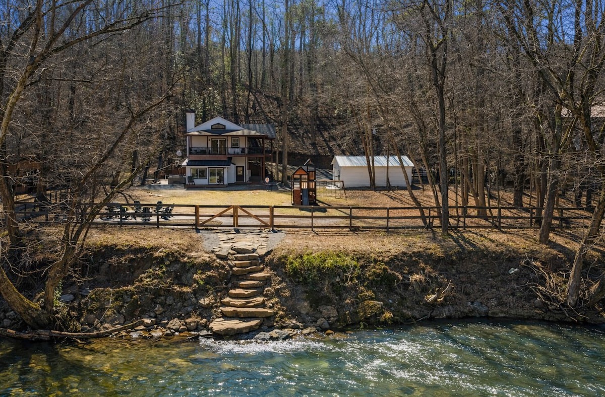 Stunning & tranquil Georgia mountain retreat on the Toccoa River. 3 master bedrooms (1 king/2 queen) & a bunk room with 4 beds. All bathrooms feature walk-in showers. Fully stocked kitchen with Keurig coffee maker & a wet bar on lower level. Deck extends to the water. Also has a fire pit, outdoor dining, grill, & plenty of outdoor seating. Excellent location for fishing, tubing & kayaking onsite. 20 mins to downtown Blue Ridge, 10 mins to downtown McCaysville & downstream from Lake Blue Ridge