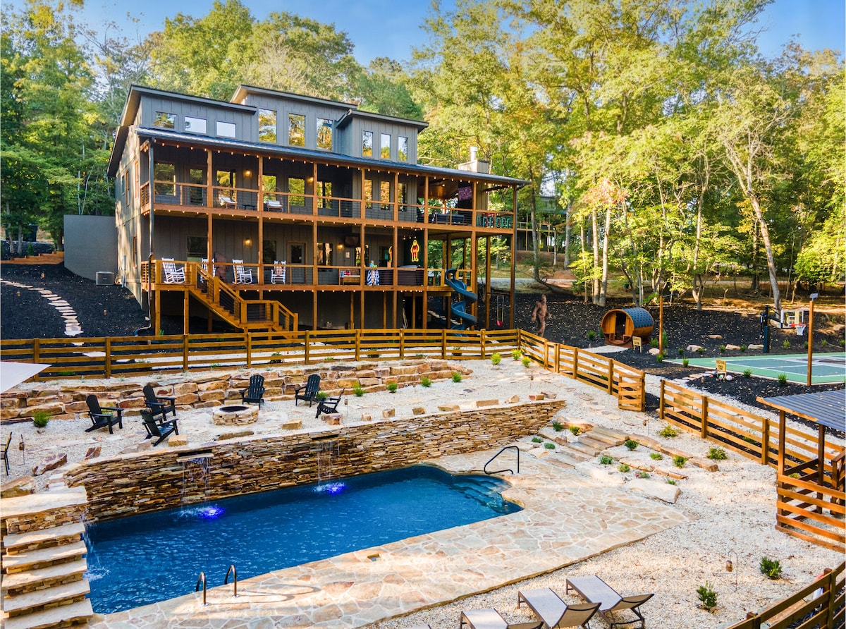 Perfect for families with little ones or pets, this cabin has all bedrooms on one floor, gated in decks and a fully fenced in yard. Soak in the hot tub on your private deck, or roast marshmallows around the outdoor fire pit. We are a 10-12 min drive to downtown Ellijay and a 20-25 min drive to downtown Blue Ridge Nestled in the Coosawattee River Resort, you'll have access to amenities, including an outdoor pool, a heated indoor pool, and parks etc.