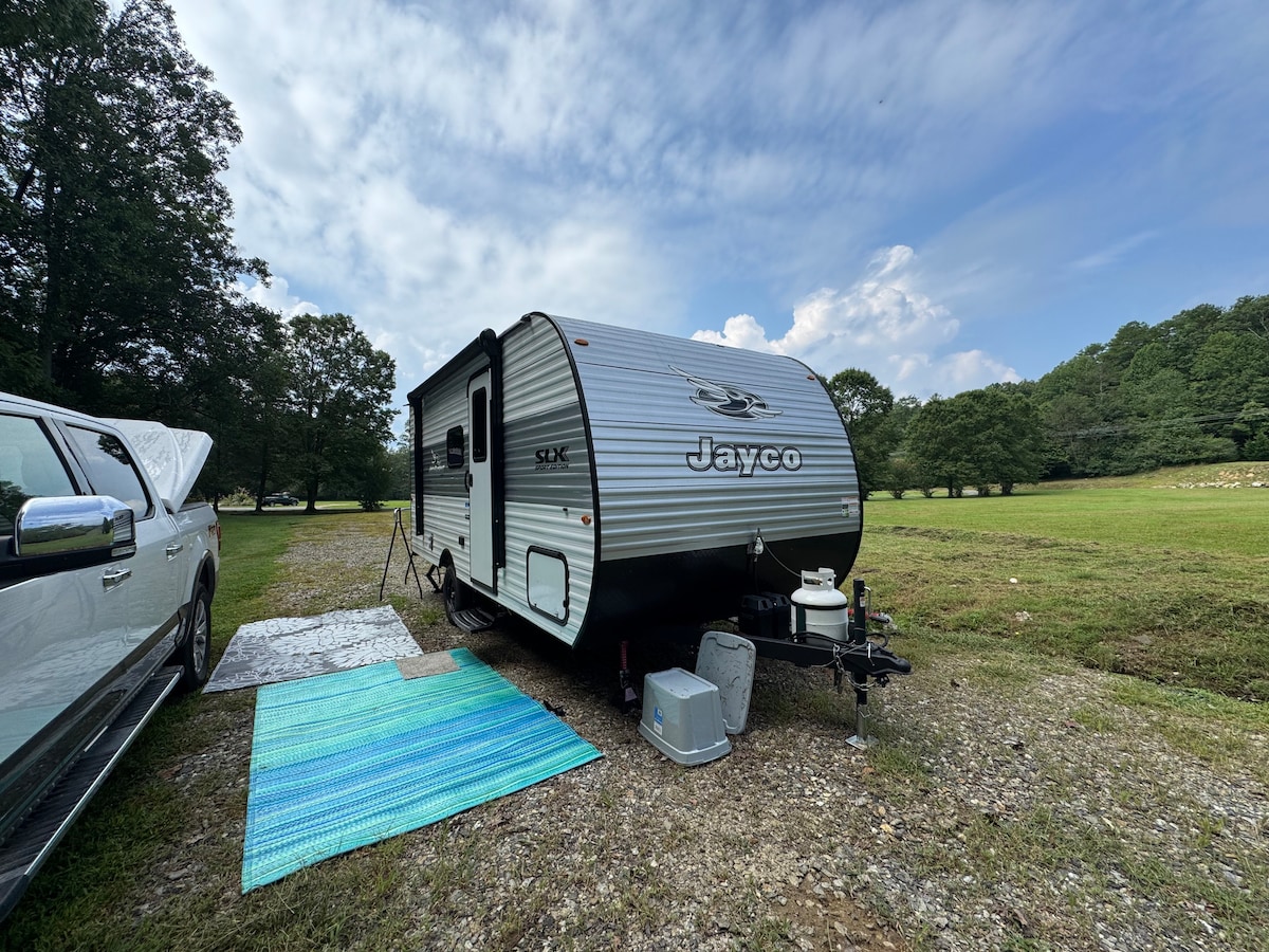 Spacious camper with private Queen bed and a set of double bunks large enough for adults or kids. All kitchen amenities inside, outdoor kitchen, outdoor shower. Creek a short walk down the path. You can fish, swim, float in a tube as the seasons allow. Less than 15 mins from downtown Ellijay but you would never know it when you are sitting at the camper. We have two tv’s but no WiFi available yet. You can watch a dvd or stream from your on hotspot. Better yet - unplug for a little bit.