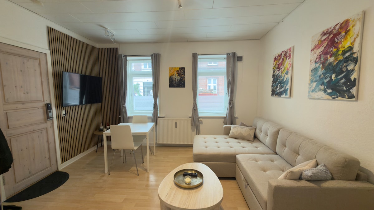 Stay in my cozy sanctuary in the heart of Esbjerg, thoughtfully designed with a warm, inviting atmosphere. Stylish furnishings, ambient lighting, and curated decor make it feel like home away from home. A spacious living area and a dedicated workspace available for business needs. Fully equipped kitchen, large, comfy bed, and a bedroom with private garden views and wonderful sunsets. Perfect for one or two guests seeking comfort and style in a beautifully designed and cozy space.