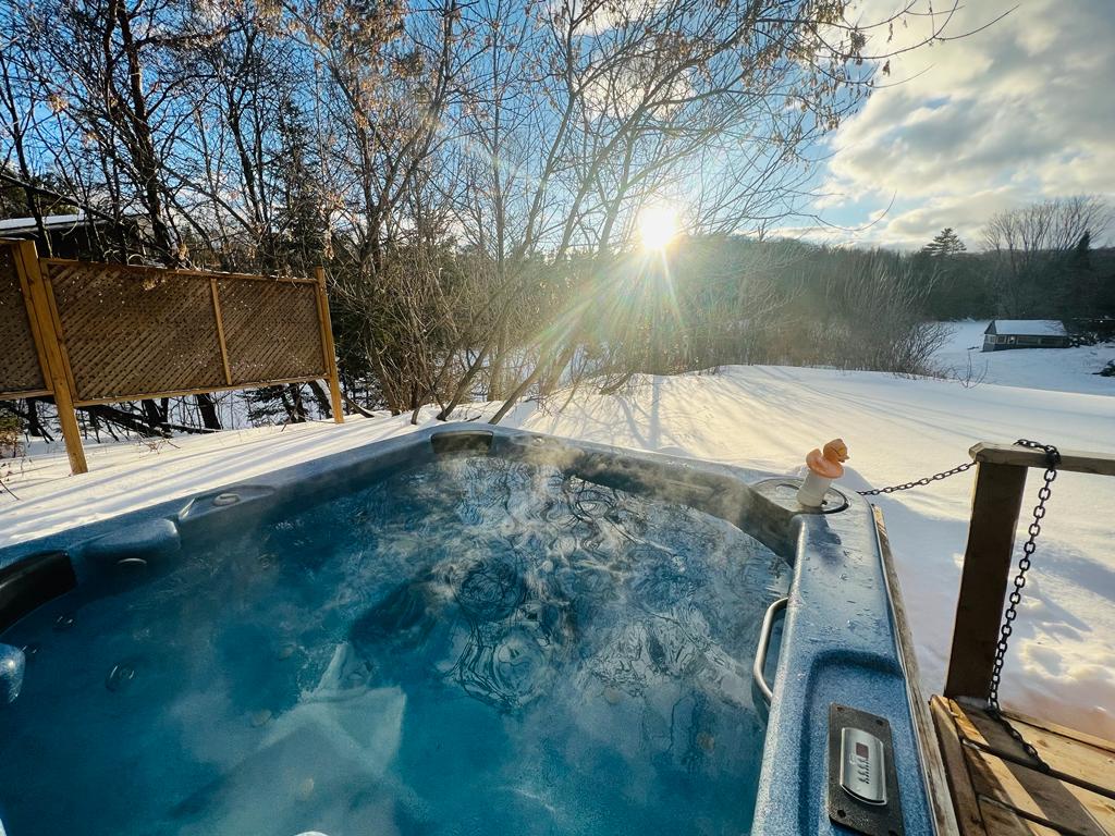 Four Season Cottage on Stimears Lake. 2 bedrooms, 1.5 bathrooms. View of the lake from kitchen, living area and primary bedroom. Small Hot tub (it is a 3 person hot tub / not a large hot tub), games room, dock, waterfront. Summer Only - kayak & row boat + above ground pool. Close to downtown Bancroft, snowmobile/ATV trails, hiking, great fishing, public boat launch, small quiet lake. Please review listing very carefully before booking. Our listing & photos are very accurate & real.