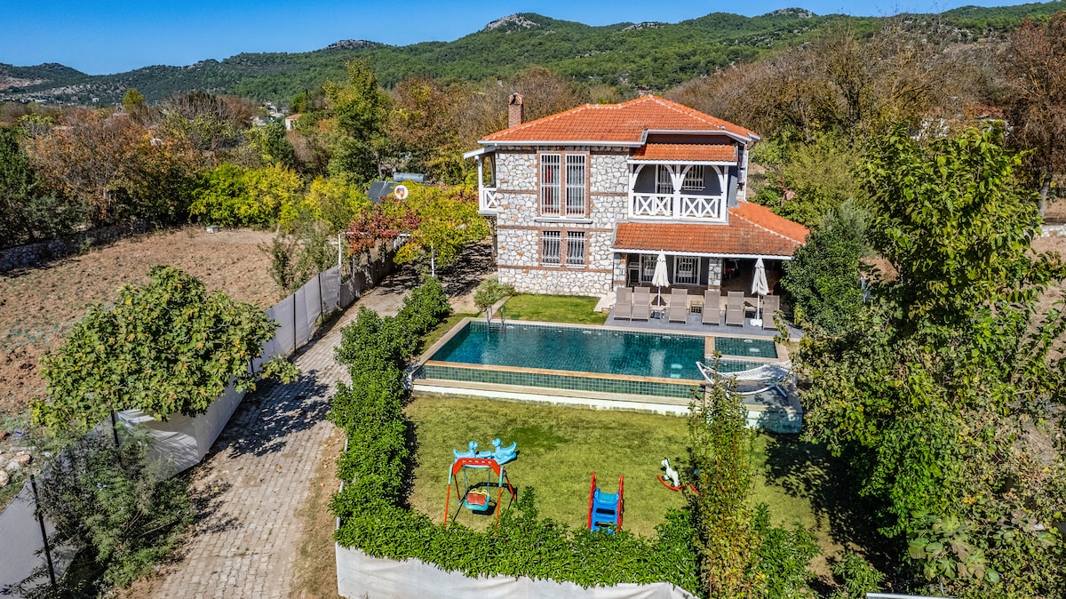 This lovely old stone house is private and peaceful and has a stunning glass mosaic roof pool with kitchen/fire pit/BBQ for watching the stars and eagles! It has stylish cool marble interiors with Turkish rugs, high spec shower rooms and a marble kitchen. It has a wood burner for winter and is suitable for guests who require privacy.
