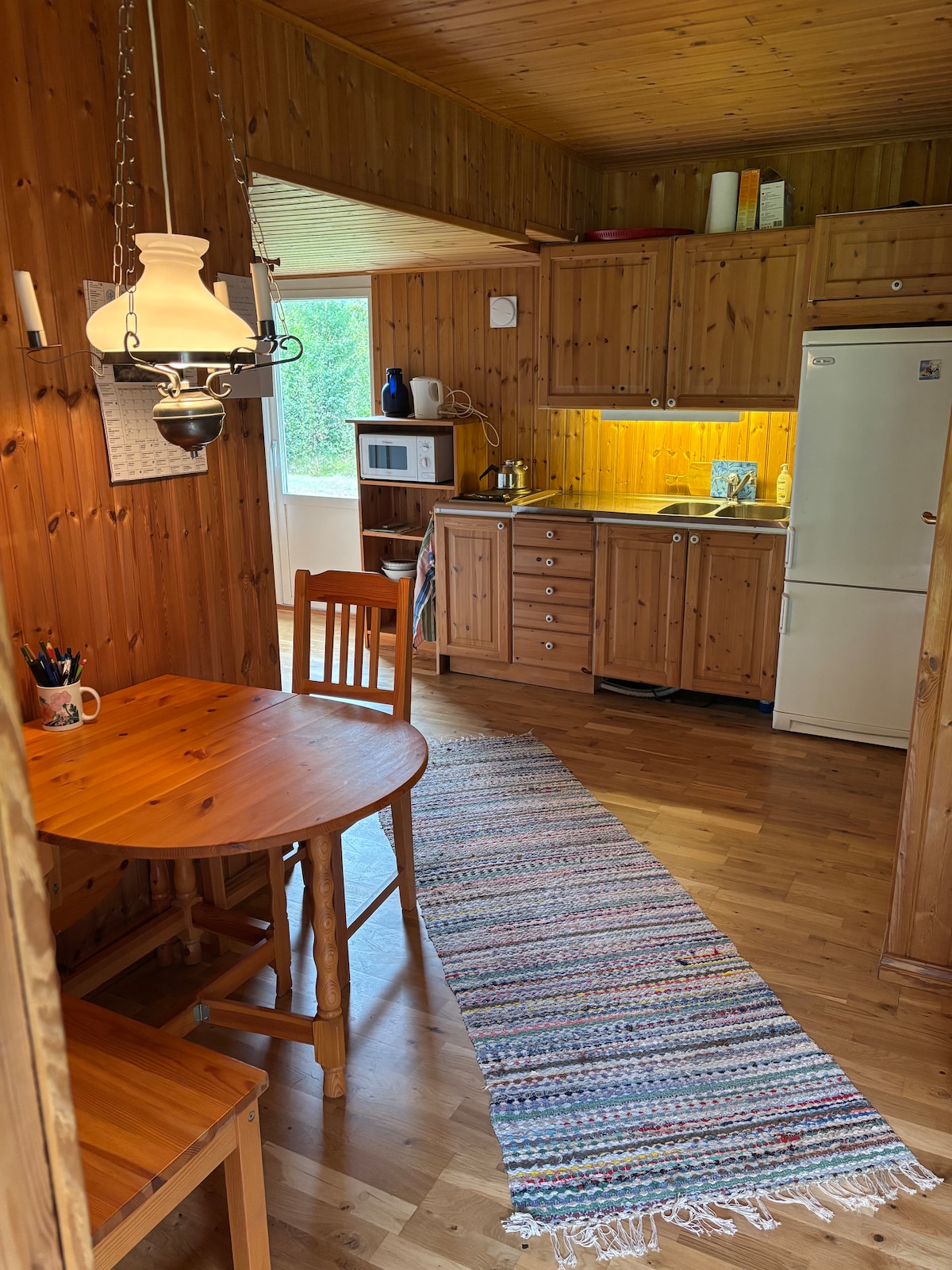 En typisk lillerstuga intill det större huset på en äldre bondgård. Inredningen är typisk åttitalsrenovering med mycket furu, men allt du behöver för några lugna semester dagar finns. Detta boende passar den som vill ta det lugnt och har andra prioriteringar än lyxig komfort. Dagarna spenderas kanske i skog o natur, eller med kanoten som finns tillgänglig i sjön. Väl hemma kanske tänder i vedspisen och låter tankarna över dagens händelser vandra.