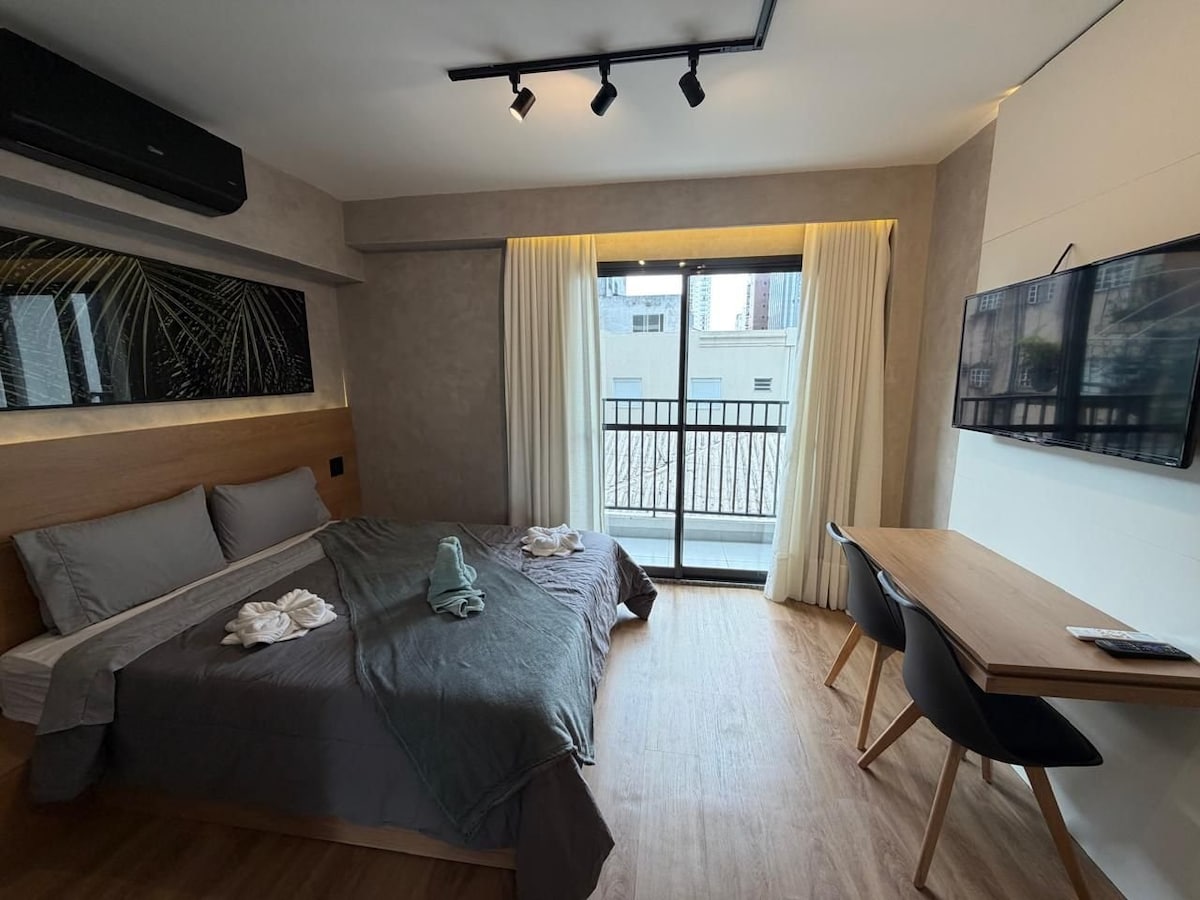 Relax in the best location of São Paulo, between Jardins and Pinheiros. This newly opened studio is a 5-minute walk to the Oscar Freire subway station, in a new building with all the infrastructure for a quiet and comfortable stay. It is on top of a bakery with artisan bread and across the street from a supermarket. The building has coworking and coliving space, laundry room, gym, rooftop pool, and a 24-hour doorkeeper. Wi-Fi 450Mbps.