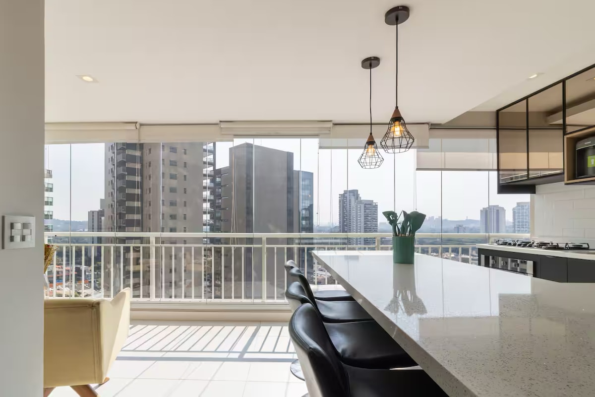 Studio lindo com uma bela vista da cidade na varanda, excepcionalmente completo e planejado. Seguro, com portaria blindada 24h. Fique no 22º andar do edifício mais próximo ao metrô Faria Lima e a 3 estações da Av. Paulista. Confortável e prático, cama king, enxoval completo, escritório com 2 telas 27', WiFi rápida, cozinha bem equipada, TV60', ducha potente e mesa para jantar. Ainda no prédio: piscina aquecida com jacuzzi, coworking, academia 24h e lavanderia. Mercado e ótimos bares bem ao lado!