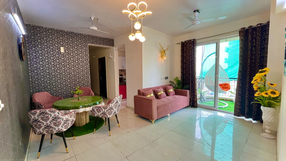 Ivy Home isn't a place, it’s a feeling "The magic thing about home is that it feels good to leave, and it feels even better to come back" An entire floor with a lit garden, super cosy rooms and projector room with beautiful decor for a one of a kind personalised movie experience. The verandah has a comfortable seating arrangement with table, chairs and some beautiful plants and trees making it a great spot for a chill evening with family/frnds even for a pleasant dinner date with your partner