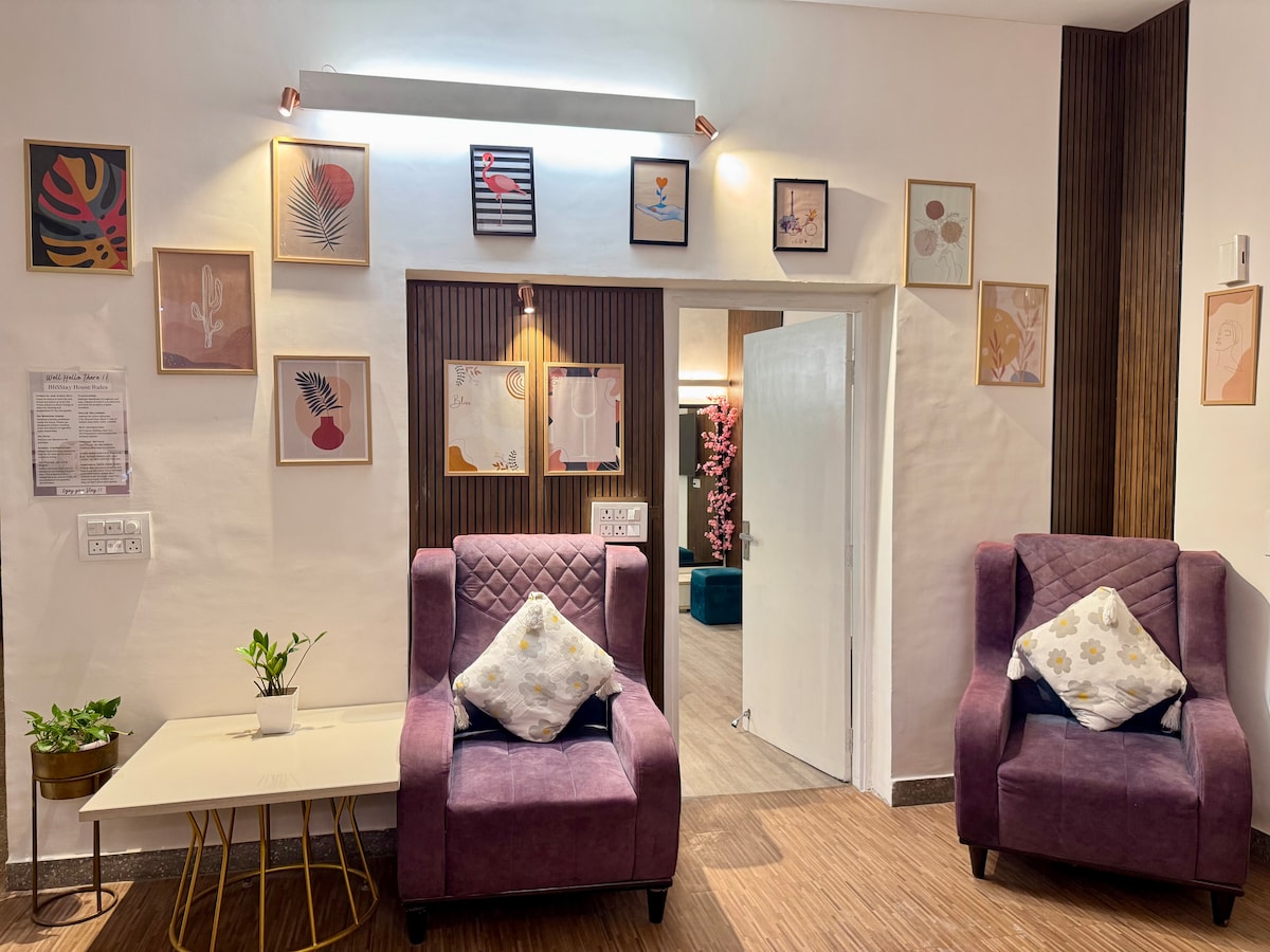 About This Property:- ✨ Master Bedroom – Featuring a Super King-size bed with an ultra-luxury Sleepwell mattress (worth ₹1.3L) for unmatched comfort, a 3-seater plush sofa, split AC, smart ceiling fan, 65-inch Android QLED TV with JBL soundbar, attached washroom, and thoughtfully designed lighting that creates a cozy, welcoming vibe. 🌿 Spacious Garden – Enjoy a 330 sq. ft. private garden with a stylish seating area, perfect for moonlit nights with fancy warm wall lights for a serene ambiance.