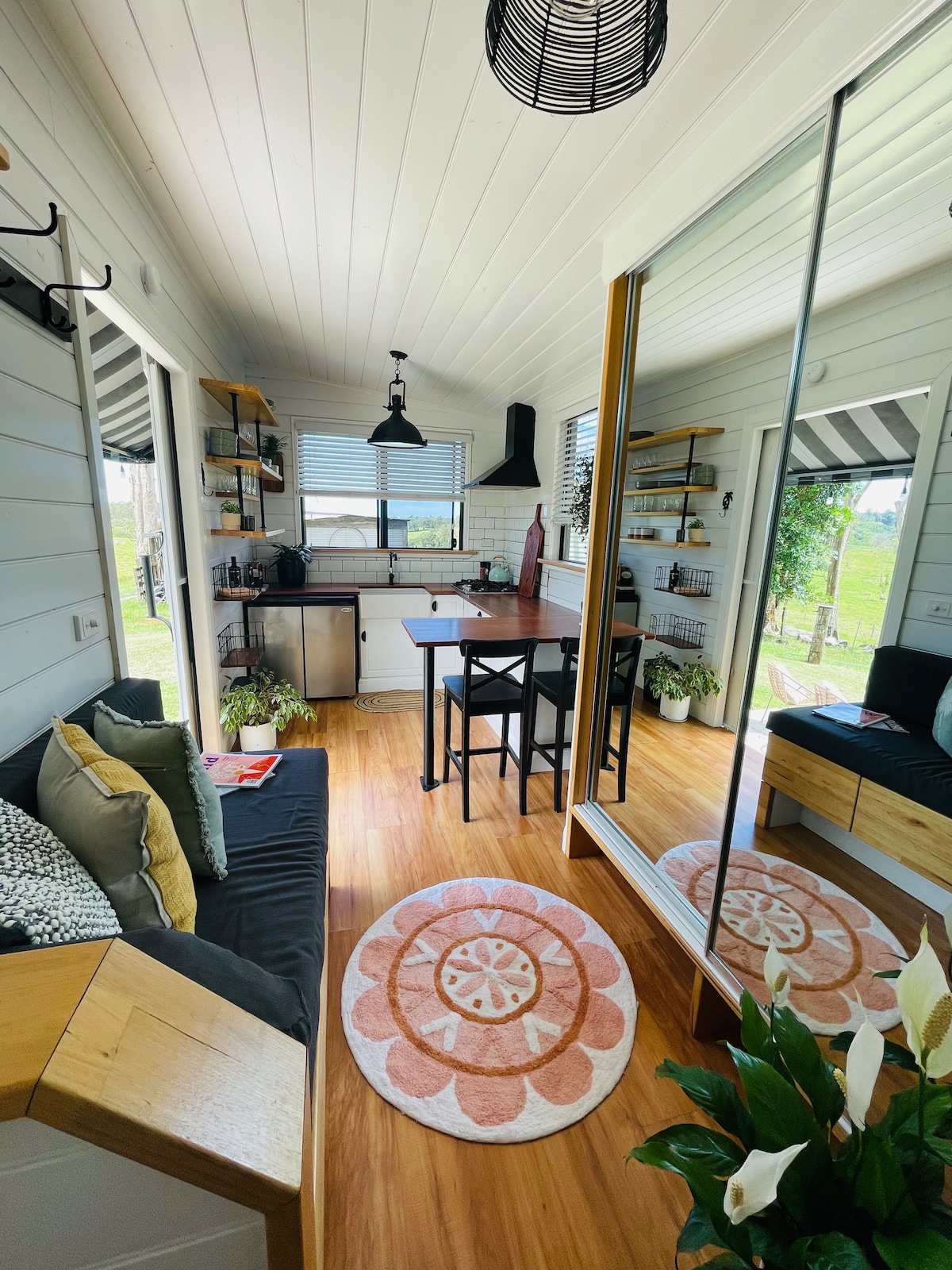 Our Tiny home is a unique space hand built by ourselves. It is parked up on a farm setting overlooking Mount Warning and Chincogan, just minutes from the best beaches, restaurants & waterfall escapes the Northern Rivers has to offer. This super sweet pad offers real deal tiny house simplicity with a luxe vibe, here it’s all about picnic brunches on the lawn, high tide ocean swims, fire lit sunsets & endless night sky gazing. Pack an overnight bag but you won’t want to leave!