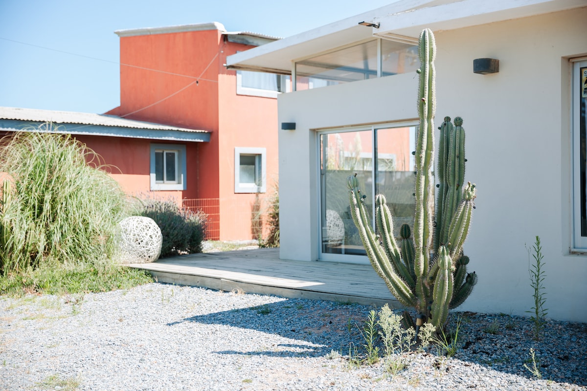 A 3km de Jose Ignacio, Casa 100% de madera, ideal para parejas que buscan tranquilidad. Tiene una hermosa vista a la laguna de Jose Ignacio y al mar, y se encuentra a 50 m de la playa. Cuenta con dos dormitorios con cama queen y capacidad para 4 personas. La sala comedor y la cocina están completamente equipadas. El deck de la piscina está orientado hacia la puesta del sol. Para los amantes del Kitesurfing contamos von el acceso directo a la laguna.