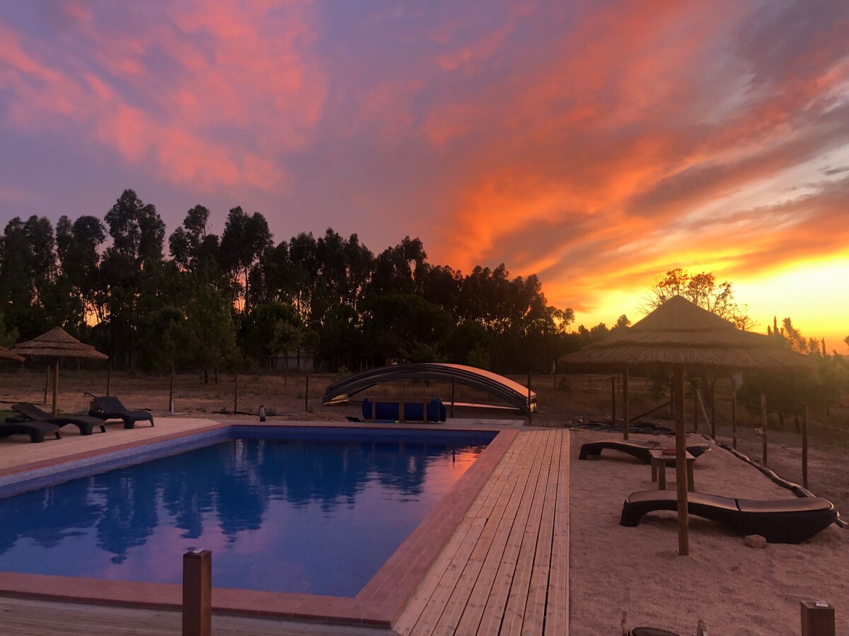 Espace protégés par des arbres, Salon Cuisine équipée, Terrasse, Piscine chauffée. 1 chambre avec un grand lit double. Au calme et au cœur de la nature. Proche de Tavira et de l'océan. Restaurants, commerces et marchés sont à proximité. Au Sud du Portugal, le soleil et la chaleur sont au rendez vous. Le linge de lit, de toilette et de bain est fournis.